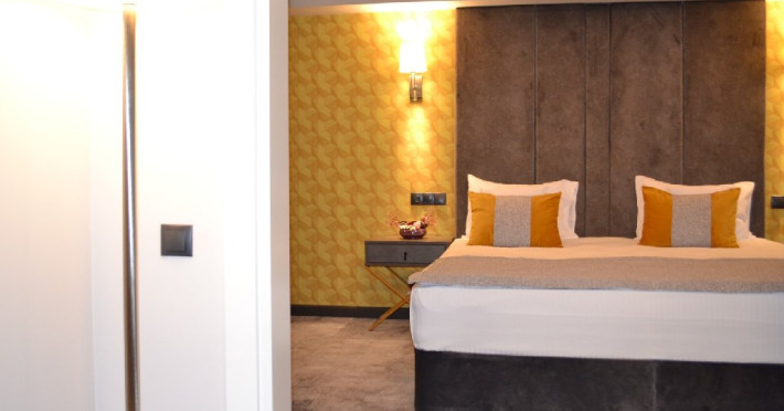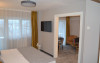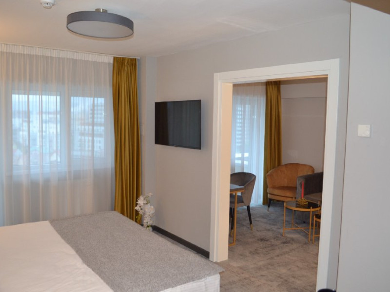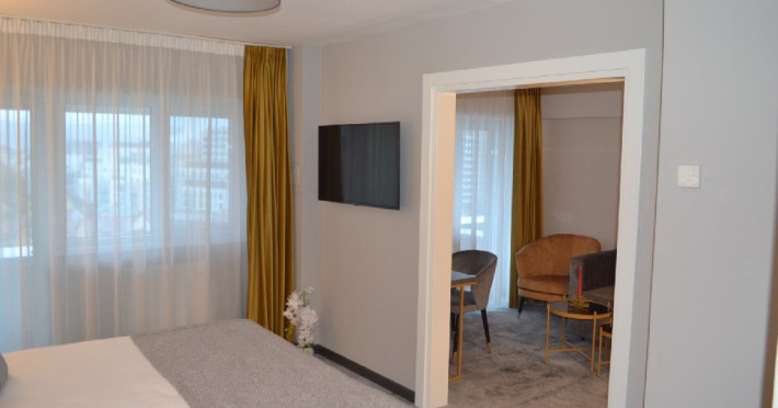 Apartament, format din living cu canapea extensibila si dormtior cu pat matrimonial, baie cu dus, uscator de par, internet, TV,AC,minibar, telefon.