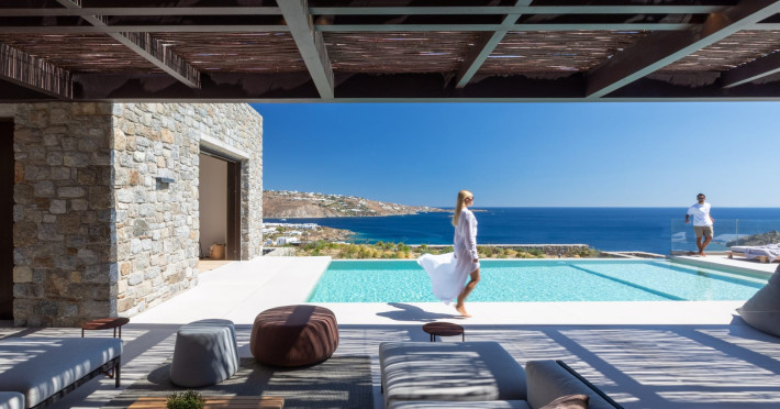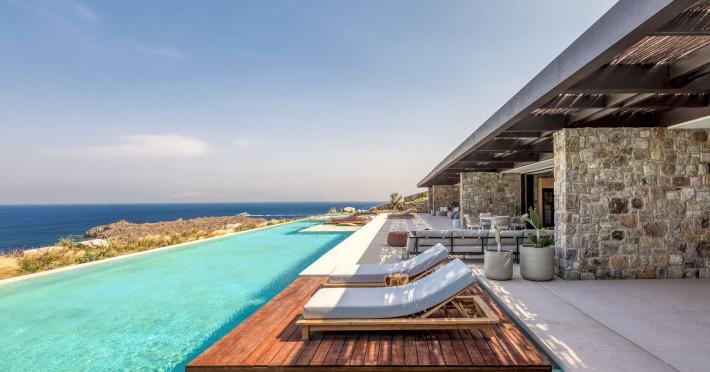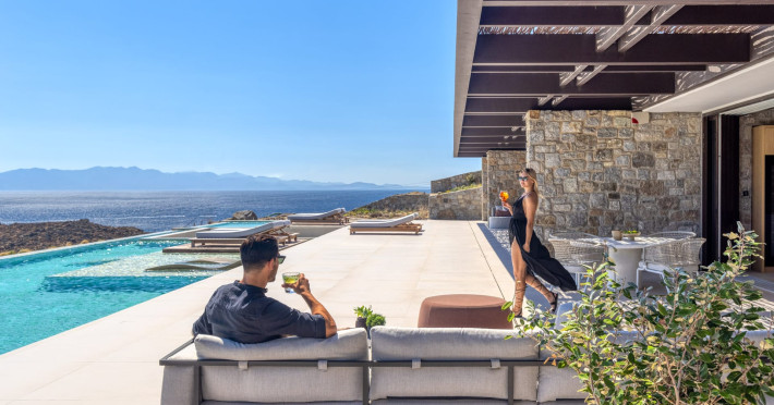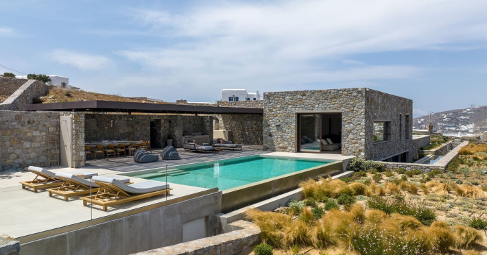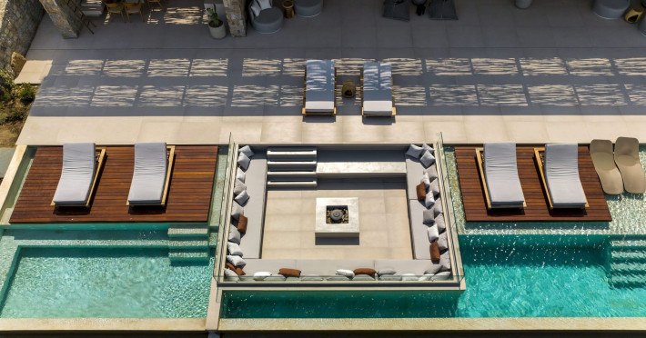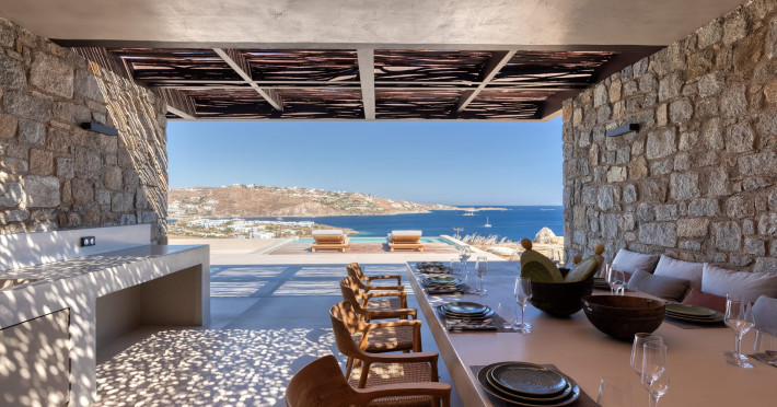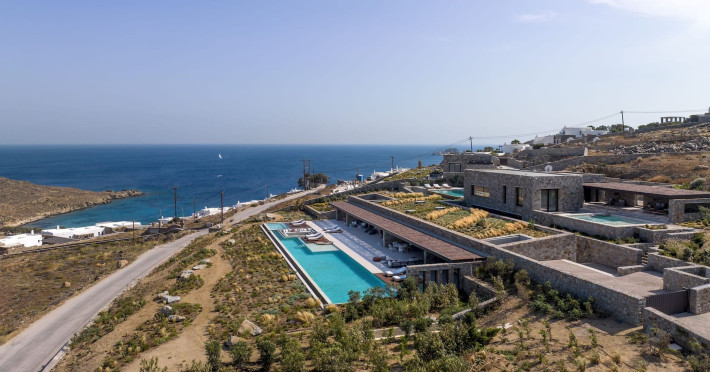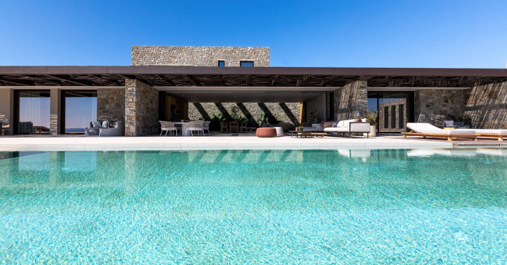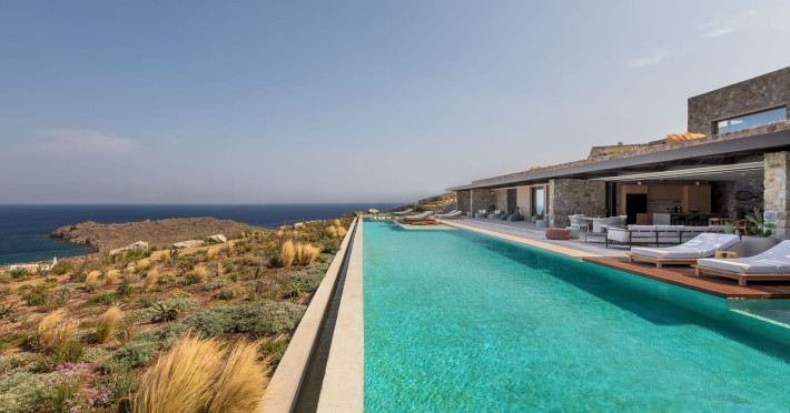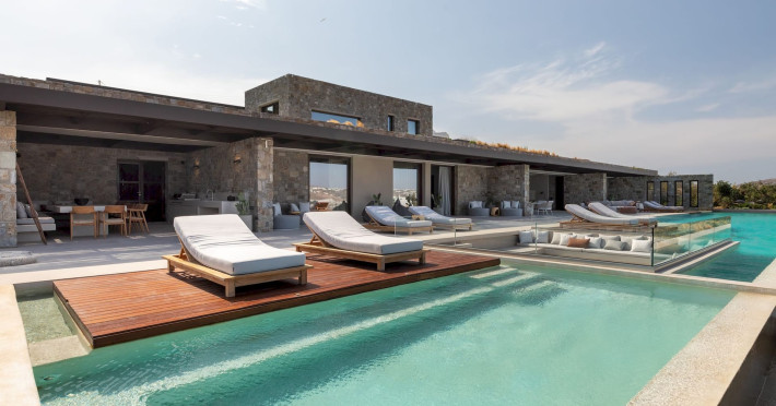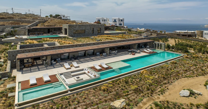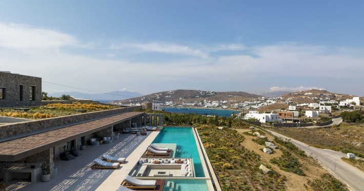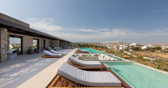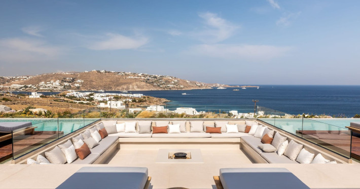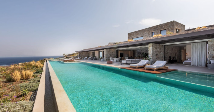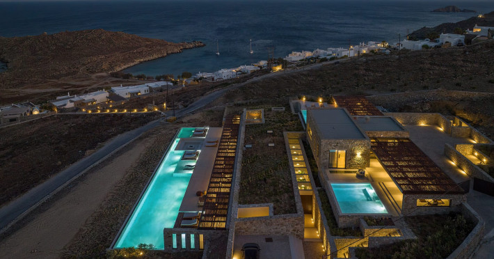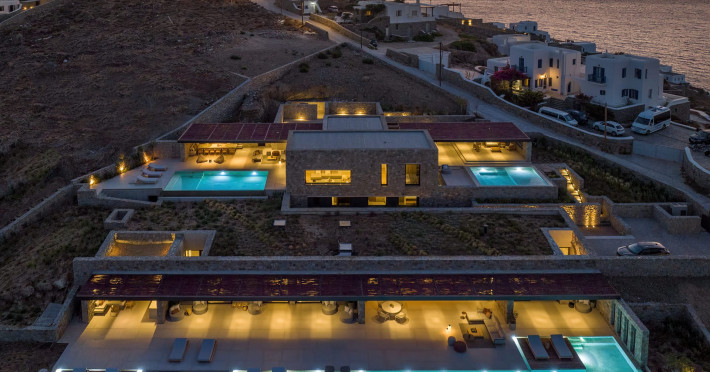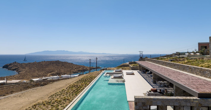 UNTOLD MYKONOSExperience unparalleled hospitalityWelcome. This experience is designed to captivate your senses.Untold Mykonos is a stunning property of unsurpassed design, created in perfect harmony with the enchanting natural landscape surrounding it. It offers complete privacy, exceptional level of comfort, and deep relaxation. Overlooking the endless blue Aegean Sea, and bathed in sunlight, its unique stone architecture and fabulous location offer an escape into indescribable luxury.The apotheosis of aestheticsWhere earth meets skyThe unsurpassed panoramic view into the horizon, where earth and sky embrace, and the enticing summer breeze, offer moments of unique relaxation and wellbeing. The calm design of the property, combined with the harmonious synthesis of natural material, and the exceptional landscape of Aleomandra, complete this luxurious setting. The location of Untold Mykonos is ideal. It offers absolute privacy and tranquillity to guests, only 200 meters from the serene, crystal clear Glyfadi beach, and has direct access to tourist amenities.Heavenly shelter Accommodating up to 20 guests, Untold Mykonos is an ode to contemporary architecture.The well-thought-through design of this impressive property allows for two types of accommodation. The first option provides accommodation throughout the entire villa, consisting of 10 bedrooms. The second option provides the option of dividing the property into 2 independent smaller villas, each consisting of 5 bedrooms.This is determined by the number of guests and the type of holiday they wish to have. These luxurious amenities are completed with 2 infinity pools, offering a unique sense of freedom, 2 outdoor Jacuzzis for deep relaxation, 1 outdoor fireplace for romantic evenings under the starry sky, a barbecue for culinary entertainment, and an indoor gym with sea view, for stimulation and wellbeing. Infinity poolThe exterior space of this luxurious property includes 2 impressive infinity pools that create the unique feeling of absolute extension of water flowing into the vast horizon and the sparkling sea. This sense of freedom combined with the breathtaking view of the Aegean Sea make swimming here a truly enjoyable and relaxing experience. The pools include floating loungers for a cool and pleasant stay under the hot and persistent summer sun. The area around the pools has additional loungers and umbrellas for shade, protection from the heat, and uninterrupted reading or mind-wandering any time of the day.2 outdoor JacuzzisAttached to the 2 infinity pools, the 2 outdoor Jacuzzis release tension, embrace the body, and gently soothe the senses during the bright sun of the day or the cool sky at night. Due to their prominent position, within the stunning infinity pools, overlooking the broad horizon, these 2 Jacuzzis are the perfect escape. They transport the mind, offering deep physical and mental relaxation.Outdoor fireplace The open fireplace of this impressive property is the epitome of luxury. Located on the central patio, facing the endless blue Aegean Sea, it was designed to host unforgettable gatherings during golden hour or under the starry sky on a cool summer night. Here, evenings are gentle, faces are lit up, moments with loved ones are warm. The outdoor fireplace and its light carve these unique moments in the guests’ memory forever.*The outdoor fireplace is available for guests staying in the 5-bedroom villa with private pool & outdoor fireplace or the 10-bedroom villa with private pool.Living room & loungeThe exceptional architectural design of the property includes 2 indoor living rooms and 4 outdoor lounge areas spread around and oriented differently along the impressive patio. Natural materials, such as stone and wood, dominating both interior and exterior, minimal design, and soft tones create a sense of tranquillity and balance, gently absorbing and diffusing light throughout the day. The luxurious, subtly decorated interior generates a light atmosphere, and blends harmoniously with its natural environment, creating comfortable, autonomous spaces in a prominent location.*The 2 living rooms and 4 lounge areas are included in the 10 bedroom villa with private swimming pool. Guests staying in the 5-bedroom villas have access to 1 indoor living room and 2 lounge areas on the terrace.2 fully equipped kitchensWhen the kitchen offers comfort, luxury, and is fully equipped cooking becomes more attractive. The 2 state-of-the-art kitchens have everything needed for meal preparation, serving simultaneously several guests, without any issues. The property becomes an attractive culinary meeting place for eclectic tastes and good company. The relaxed mood and summer atmosphere create unique and unforgettable experiences.*2 kitchens are available for guests staying in the 10-bedroom villa with private pool.Each 5-bedroom villa has 1 kitchen.Indoor gymThe unforgettable sensation of exercising the body is a luxury that should not be subject to limitations. For fitness enthusiasts, the property has a fully equipped and state-of-the-art indoor gym with sea view. Here, sea salt floods the senses and fresh air caresses the body while exercising, providing excellent stimulation and both physical and mental rejuvenation.*The indoor gym is available for guests staying in the 5-bedroom villa with private pool & outdoor fireplace or the 10-bedroom villa with private pool.The best sights and the most beautiful beaches of MykonosMykonos TownInexhaustible. Lively. Everlasting. Luminous. Colourful. Bright. Intoxicating. Fun.Like a fairy tale unfolding before your eyes, the beautiful island of Mykonos patiently awaits visitors to submerge them into a real, thrilling summer adventure.Mykonos Town, one of the world's most popular destinations, is bustling with life every summer under the persistent, intoxicating, hot Cycladic sun. The island's lazy morning vibes treat you to coffee and spoon sweets in the calm, picturesque streets, adorned wi