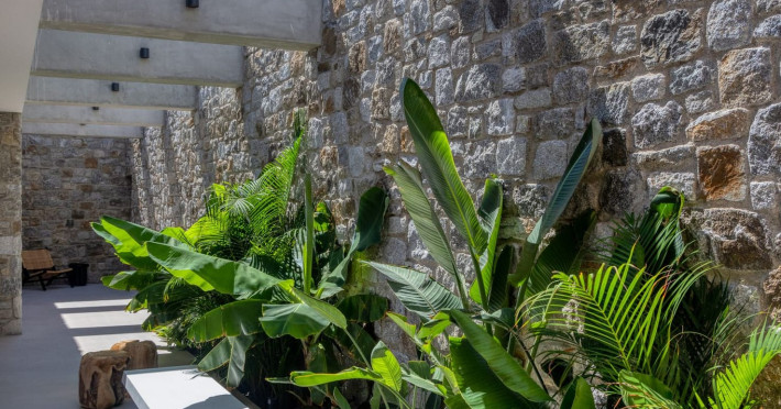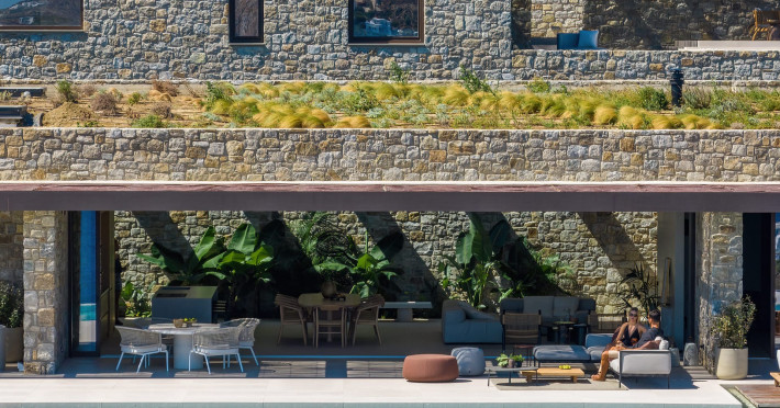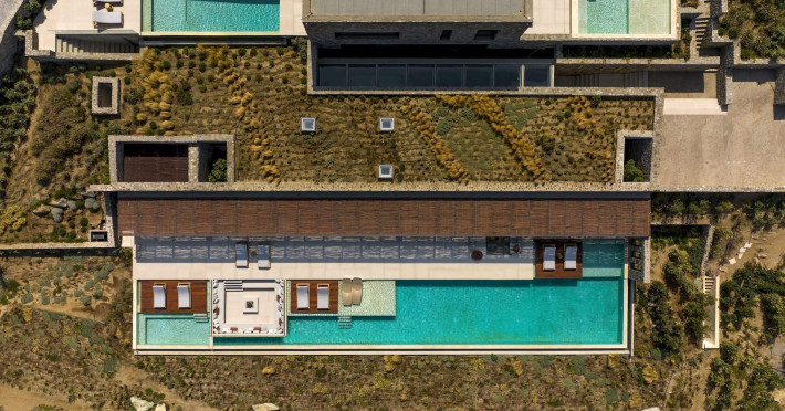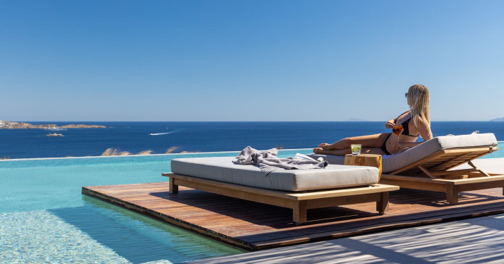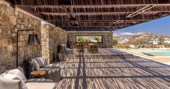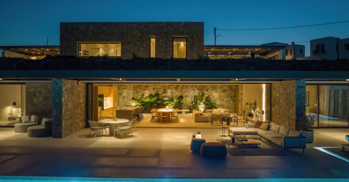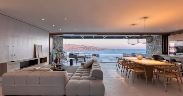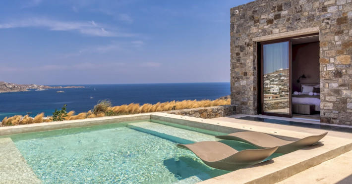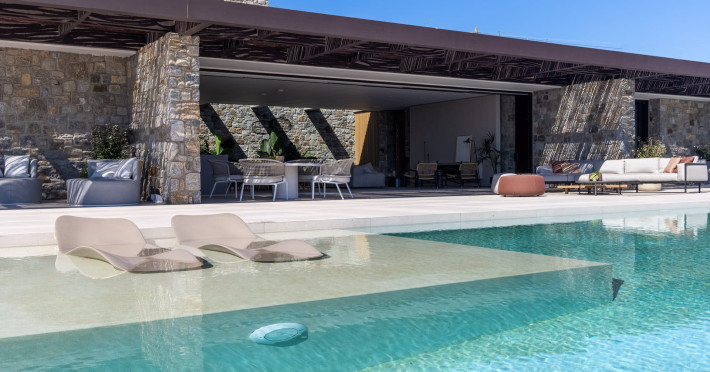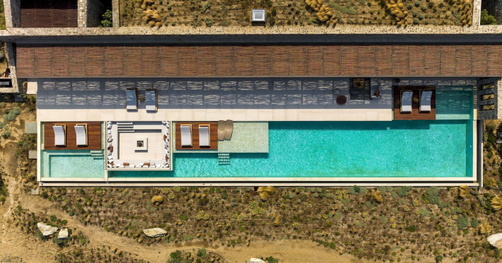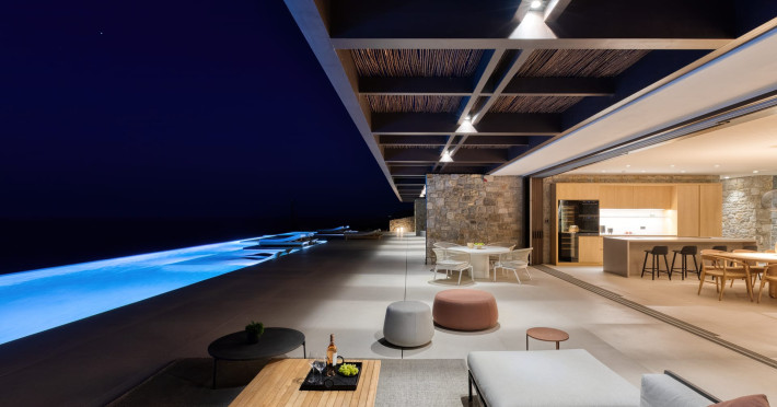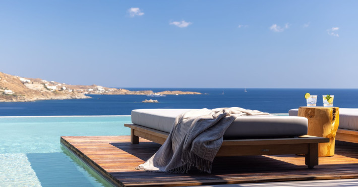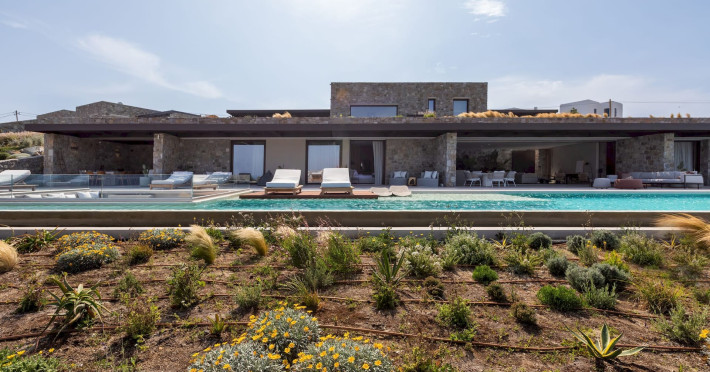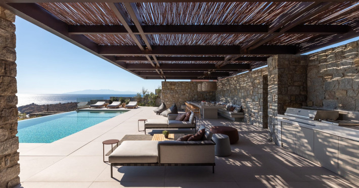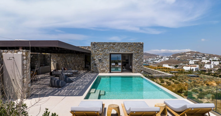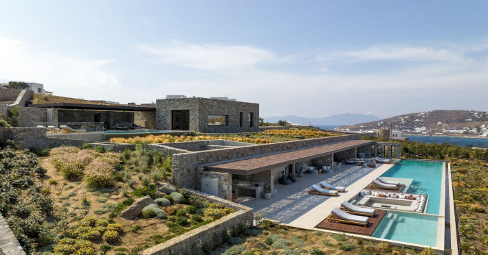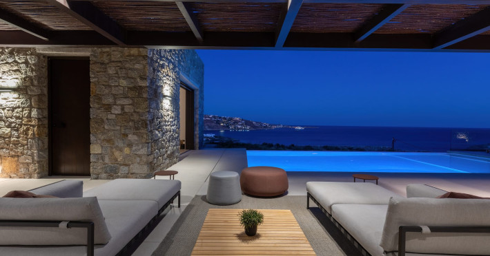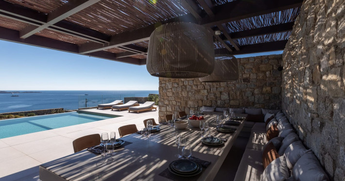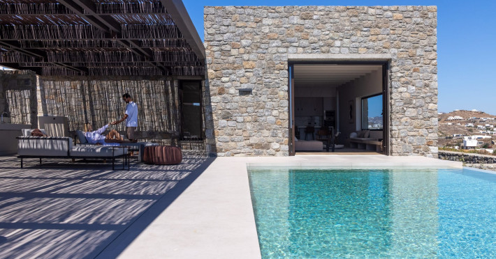UNTOLD MYKONOSExperience unparalleled hospitalityWelcome. This experience is designed to captivate your senses.Untold Mykonos is a stunning property of unsurpassed design, created in perfect harmony with the enchanting natural landscape surrounding it. It offers complete privacy, exceptional level of comfort, and deep relaxation. Overlooking the endless blue Aegean Sea, and bathed in sunlight, its unique stone architecture and fabulous location offer an escape into indescribable luxury.The apotheosis of aestheticsWhere earth meets skyThe unsurpassed panoramic view into the horizon, where earth and sky embrace, and the enticing summer breeze, offer moments of unique relaxation and wellbeing. The calm design of the property, combined with the harmonious synthesis of natural material, and the exceptional landscape of Aleomandra, complete this luxurious setting. The location of Untold Mykonos is ideal. It offers absolute privacy and tranquillity to guests, only 200 meters from the serene, crystal clear Glyfadi beach, and has direct access to tourist amenities.Heavenly shelter Accommodating up to 20 guests, Untold Mykonos is an ode to contemporary architecture.The well-thought-through design of this impressive property allows for two types of accommodation. The first option provides accommodation throughout the entire villa, consisting of 10 bedrooms. The second option provides the option of dividing the property into 2 independent smaller villas, each consisting of 5 bedrooms.This is determined by the number of guests and the type of holiday they wish to have. These luxurious amenities are completed with 2 infinity pools, offering a unique sense of freedom, 2 outdoor Jacuzzis for deep relaxation, 1 outdoor fireplace for romantic evenings under the starry sky, a barbecue for culinary entertainment, and an indoor gym with sea view, for stimulation and wellbeing. Infinity poolThe exterior space of this luxurious property includes 2 impressive infinity pools that create the unique feeling of absolute extension of water flowing into the vast horizon and the sparkling sea. This sense of freedom combined with the breathtaking view of the Aegean Sea make swimming here a truly enjoyable and relaxing experience. The pools include floating loungers for a cool and pleasant stay under the hot and persistent summer sun. The area around the pools has additional loungers and umbrellas for shade, protection from the heat, and uninterrupted reading or mind-wandering any time of the day.2 outdoor JacuzzisAttached to the 2 infinity pools, the 2 outdoor Jacuzzis release tension, embrace the body, and gently soothe the senses during the bright sun of the day or the cool sky at night. Due to their prominent position, within the stunning infinity pools, overlooking the broad horizon, these 2 Jacuzzis are the perfect escape. They transport the mind, offering deep physical and mental relaxation.Outdoor fireplace The open fireplace of this impressive property is the epitome of luxury. Located on the central patio, facing the endless blue Aegean Sea, it was designed to host unforgettable gatherings during golden hour or under the starry sky on a cool summer night. Here, evenings are gentle, faces are lit up, moments with loved ones are warm. The outdoor fireplace and its light carve these unique moments in the guests’ memory forever.*The outdoor fireplace is available for guests staying in the 5-bedroom villa with private pool & outdoor fireplace or the 10-bedroom villa with private pool.Living room & loungeThe exceptional architectural design of the property includes 2 indoor living rooms and 4 outdoor lounge areas spread around and oriented differently along the impressive patio. Natural materials, such as stone and wood, dominating both interior and exterior, minimal design, and soft tones create a sense of tranquillity and balance, gently absorbing and diffusing light throughout the day. The luxurious, subtly decorated interior generates a light atmosphere, and blends harmoniously with its natural environment, creating comfortable, autonomous spaces in a prominent location.*The 2 living rooms and 4 lounge areas are included in the 10 bedroom villa with private swimming pool. Guests staying in the 5-bedroom villas have access to 1 indoor living room and 2 lounge areas on the terrace.2 fully equipped kitchensWhen the kitchen offers comfort, luxury, and is fully equipped cooking becomes more attractive. The 2 state-of-the-art kitchens have everything needed for meal preparation, serving simultaneously several guests, without any issues. The property becomes an attractive culinary meeting place for eclectic tastes and good company. The relaxed mood and summer atmosphere create unique and unforgettable experiences.*2 kitchens are available for guests staying in the 10-bedroom villa with private pool.Each 5-bedroom villa has 1 kitchen.Indoor gymThe unforgettable sensation of exercising the body is a luxury that should not be subject to limitations. For fitness enthusiasts, the property has a fully equipped and state-of-the-art indoor gym with sea view. Here, sea salt floods the senses and fresh air caresses the body while exercising, providing excellent stimulation and both physical and mental rejuvenation.*The indoor gym is available for guests staying in the 5-bedroom villa with private pool & outdoor fireplace or the 10-bedroom villa with private pool.The best sights and the most beautiful beaches of MykonosMykonos TownInexhaustible. Lively. Everlasting. Luminous. Colourful. Bright. Intoxicating. Fun.Like a fairy tale unfolding before your eyes, the beautiful island of Mykonos patiently awaits visitors to submerge them into a real, thrilling summer adventure.Mykonos Town, one of the world's most popular destinations, is bustling with life every summer under the persistent, intoxicating, hot Cycladic sun. The island's lazy morning vibes treat you to coffee and spoon sweets in the calm, picturesque streets, adorned wi