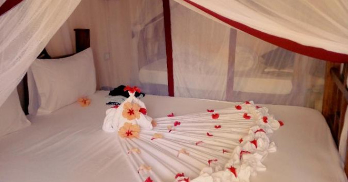 Fiecare cameră este în sistem self-catering şi are acoperiş din paie, mobilier tradiţional din Zanzibar şi verandă cu vedere la grădina luxuriantă. Toate unităţile de cazare oferă aer condiţionat, minifrigider şi TV. Băile proprii sunt dotate cu duş şi bideu.