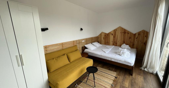 Fiecare bungalow este echipat cu pat dublu de 1,60m latime si canapea extensibila iar cele cateva piese esentiale de mobil completeaz experienta de glamping.