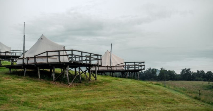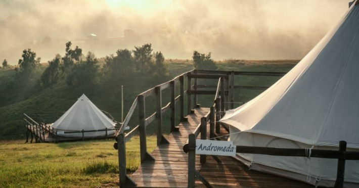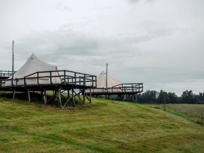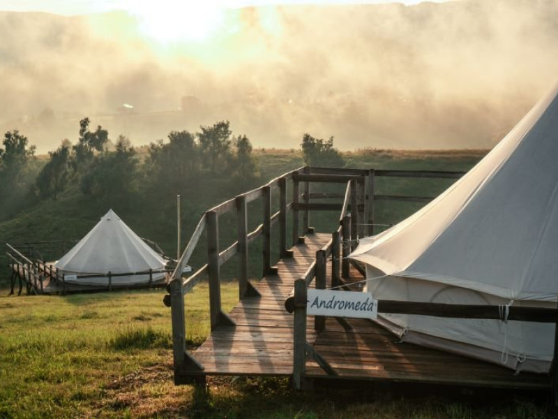 Fiecare cort este echipat cu tot confortul de care vei avea nevoie si maximul pe care natura itil permite. Un cort are 3m inaltime si este amplasat pe o platform din lemn, astfel incat nu exist contact direct cu solul. Pe aceast mic teras poti sta la soare sau iti poti savura cafeaua. Inauntru, aerul circul multumita bumbacului special din care este construit cortul, astfel incat confortul tau este maxim. Cele catteva piese esentiale de mobil completeaz experienta de glamping. Fiecare pat e incapator, iar mica soba ca pe vremea bunicii itii va asigura un somn linistit.