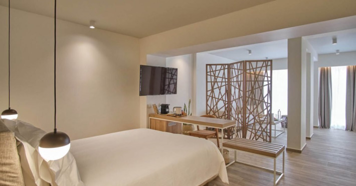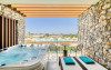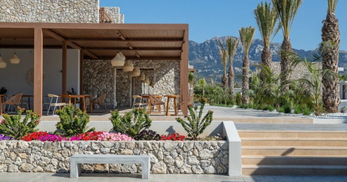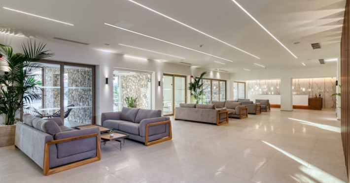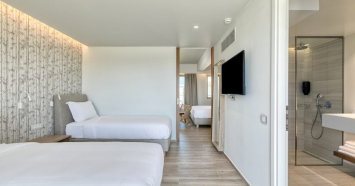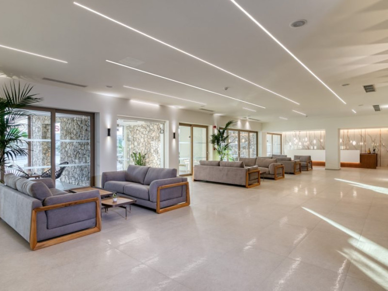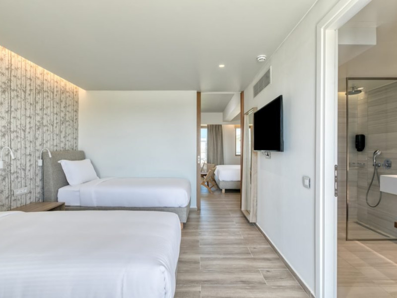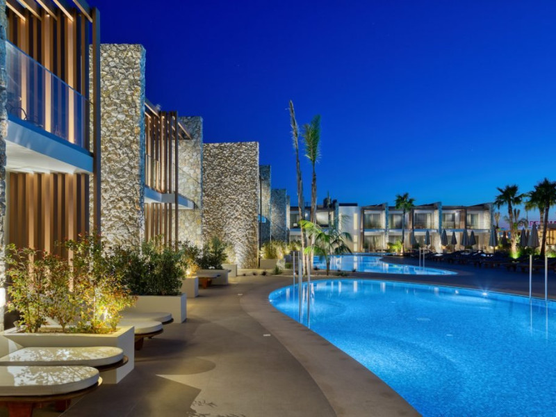 Facilitati hotel: Hotelul pune la dispozitia oaspetilor lounge bar cu terasa, pool baruri, health & coffee bar (contra cost), restaurant principal non-smoking pentru mic dejun, pranz si cina, precum si restaurante a la carte cu specific italian si mediteranean (rezervare necesara, acces 16+ pentru restaurantul mediteranean). Printre facilitati se numara spa cu jacuzzi, sauna si baie de aburi (contra cost), sala de fitness gratuita, kids club si loc de joaca exterior, doua piscine cu apa dulce cu piscina separata pentru copii si tobogane mici, terasa pentru plaja cu sezlonguri, prosoape si umbrele gratuite, teatru si biserica ortodoxa greaca pentru ceremonii. Pentru activitati sportive sunt disponibile teren de tenis cu gazon artificial, teren de padel, tenis de masa si program de animatie usoara pe timpul zilei. Sporturile nautice, inchirierea de biciclete, mopede sau masini sunt disponibile in apropiere, contra cost.