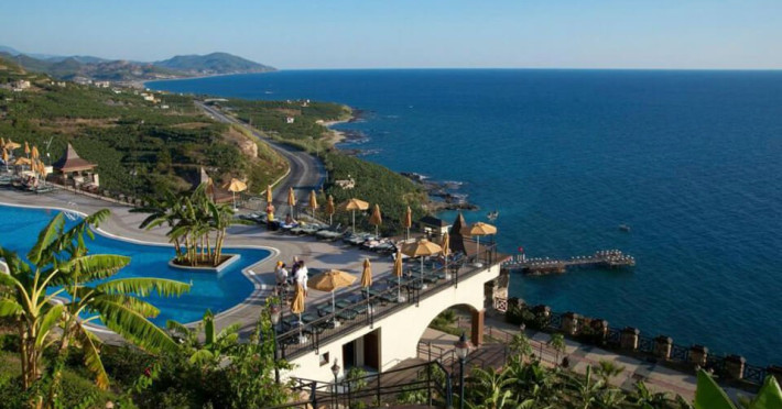 Descriere: Hotelul este construit pe un teritoriu cu o suprafata de 105000 mp, este situat pe un deal inalt si este format din cladirea principala si vile avand in total 567 de camere. Cladirea principala si vilele sunt conectate prin intermediul a 2 lifturi si pasarele.Localizare: Hotelul este situat la 20 km de centrul orasului Alanya, la 155 km fata de aeroportul Antalya si la 18 km fata de aeroportul Gazipasa Alanya.