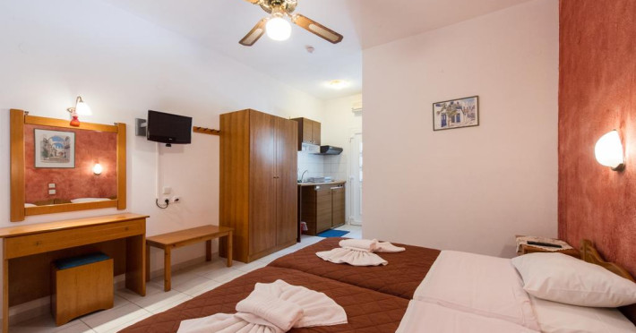 Fiecare cameră dispune de mașină pentru preparare cafea sau ceai și fierbător Camerele au balcon cu masă și scaune unde pot fi petrecute momente de relaxare. Camerele confortabile de la Vassilis Studios au pardoseală de gresie/ marmură, aer condiționat, Tv cu canale prin satelit și seif. În camere există baie cu cadă sau duș prevăzută cu foehn. Oaspeții au acces gratuit la serviciul Wi-fi în camere. Curățenia in cameră se face zilnic. În fiecare unitate de cazare există o bucătărie utilată cu frigider, plită de gătit și ustensile de bucătărie. Proprietatea oferă camere pentru nefumători.