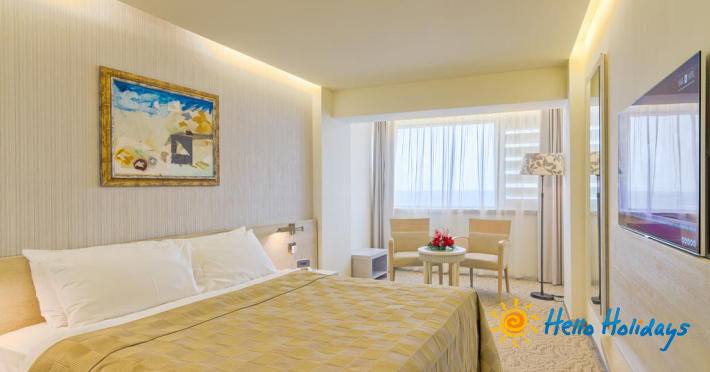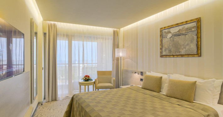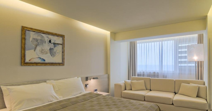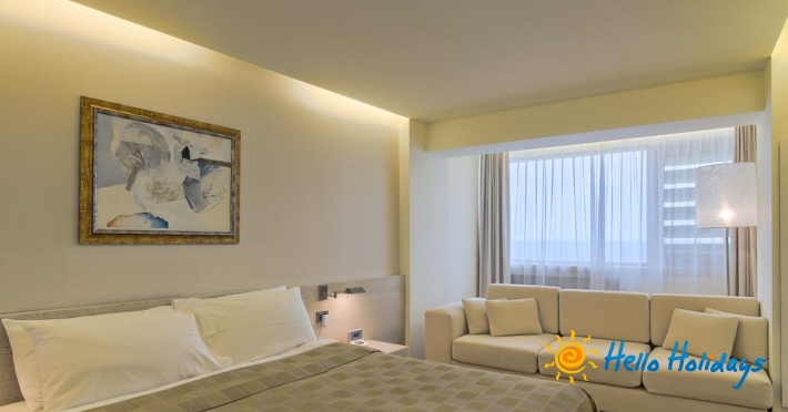 Apartamentele Junior Suite au vedere laterala la mare si sunt formate dintr-un living cu o canapea extensibila, chicineta si un dormitor cu pat matrimonial. Capacitate maxima: 2 adulti si 2 copii sau 3 adulti si 1 copil. Suprafata camerei masoara 57 mp.