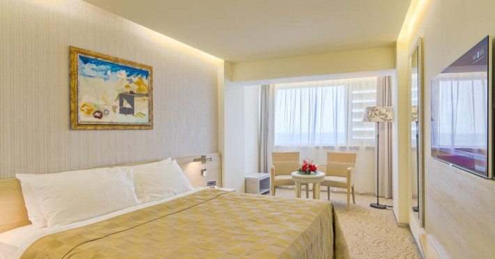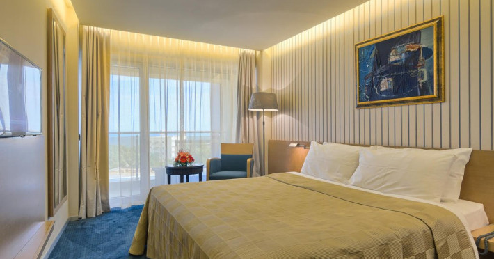 Camerele duble cu balcon ale hotelului Vega din Mamaia au paturi matrimoniale si beneficiaza de vedere laterala la mare.