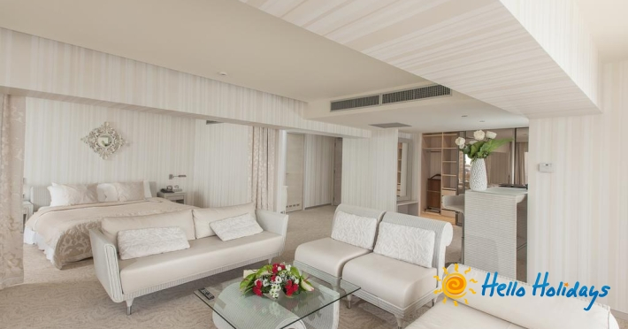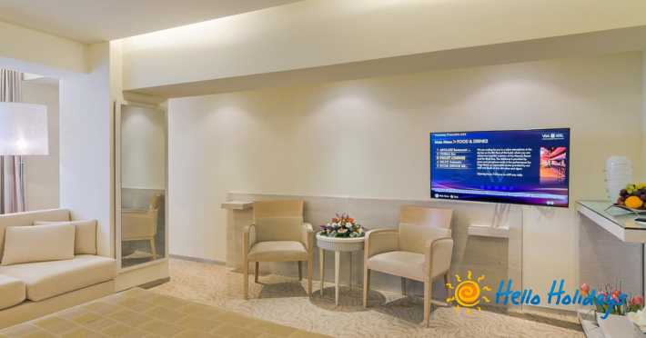 Apartamentele Senior Suite au vedere frontala la mare si sunt formate dintr-un living cu una sau doua canapele fixe, chicineta si un dormitor cu pat matrimonial. Capacitate maxima: 2 adulti (si 1 copil acolo unde exista canapeaua fixa pentru dormit). Suprafata camerei masoara 65 mp.