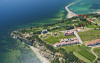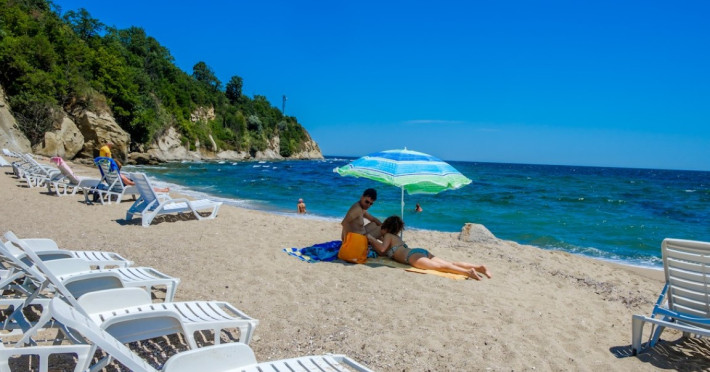 - plaja cu nisip, publica; umbrele de soare si sezlonguri – contra cost