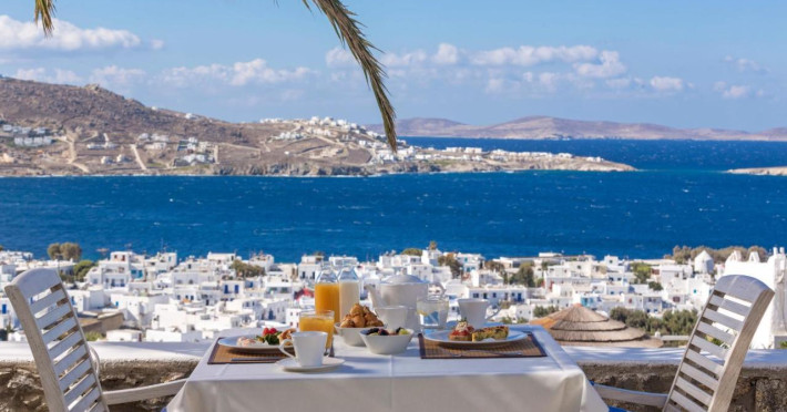 Camerele spaţioase, cu vedere la Marea Egee, la oraşul Mykonos şi curtea hotelului, au mobilier de culoare deschisă şi sunt dotate cu frigider, TV prin satelit şi aer condiţionat. Papuci de casă și articole de toaletă sunt oferite.