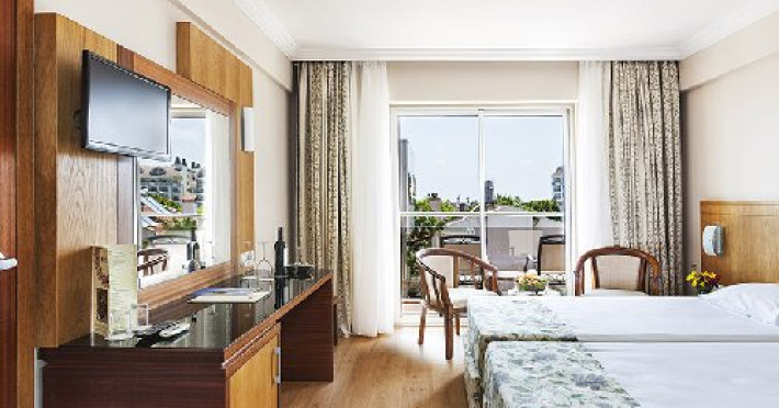 Construit in anul 2005, cu o suprafata totala de 7.800 mp, hotelul dispune de 235 camere, repartizate astfel: 121 camere standard (suprafata cuprinsa intre 22 si 29 mp, capacitate maxima 3 pers.), compuse dintr-un dormitor si baie 100 camere cu conexiune (suprafata 22 x 2 mp, capacitate 6 pers.) compuse din 2 dormitoare si baie 14 camere tip corner (suprafata 29 mp, capacitate maxima 3 pers.) compuse dintr-un dormitor si baie Localizare: pe plaja, la 45 km de centrul orasului Antalya si 35 km de aeroport. Dotari camera: balcon sau terasa, WC, cada, uscator de par, telefon in baie, aer conditionat centralizat, minibar, seif, TV satelit, canale de muzica (TV), vedere la mare Facilitati hotel: restaurant principal, restaurante a la carte, baruri, snack bar, bistro bar, pool bar, discoteca, piscina exterioara si interioara, piscina pentru copii, sauna, sala fitness, sala de conferinta de 300 persoane, salon multifunctional, baie turceasca, teren de tenis, tenis de masa, volei pe plaja, baschet, darts, sporturi acvatice nemotorizate, animatie, parcare. Servicii cu plata: iluminatul terenurilor de tenis, sporturi acvatice motorizate, bauturi imbuteliate, sucurile naturale din fructe, unele bauturi de import, spalatorie, room service, telefon si fax, fotocopiator, doctor si asistent, baby sitter, inchiriere masini, magazine, masaj, peeling. Plaja cu nisip si pietricele. Sezlongurile, prosoapele si umbrelele sunt gratuite. Alte informatii: animalele de companie nu sunt acceptate in hotel fumatul nu este permis hotelul are 3 camere pentru persoane cu dizabilitati mancarea si bautura nu sunt gratuite dupa ora 2 recomandam turistilor sa solicite conceptul la receptia hotelului Hotelul isi rezerva dreptul de a modifica conceptul in timpul sezonului fara a anunta in prealabil aceste modificari.Datorita dinamicitatii domeniului disponibilitatea ofertelor se modifica de la un moment la altul. De aceea ofertele sunt valabile in limita locurilor disponibile. Agentia nu este responsabila pentru eventualele neconcordante care pot aparea intre informatiile privind tarifele si alte detalii din site si informatiile primite in agentie. In aceste cazuri vor avea prioritate, intotdeauna, informatiile primite in agentie.