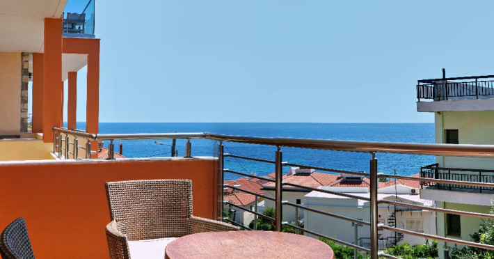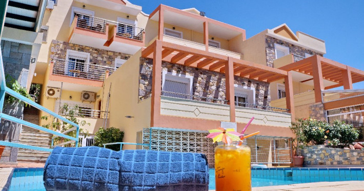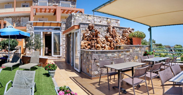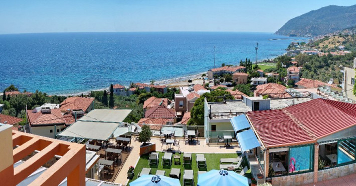 Cu un design modern si ecologic, hotelul se armonizeaza perfect cu peisajul natural, avand o frumoasa panorama catre albastrul Marii Egee.
