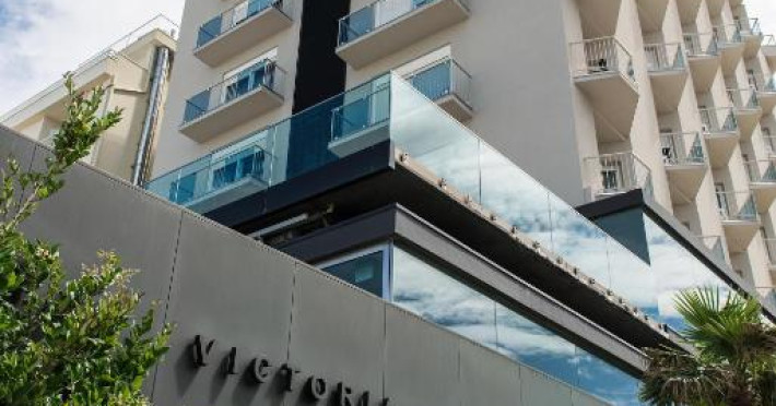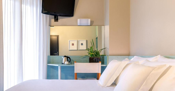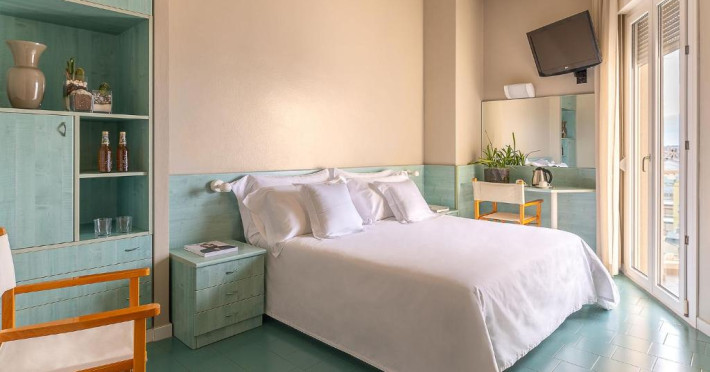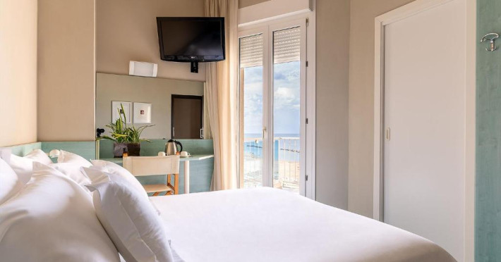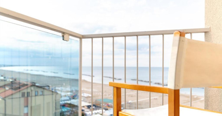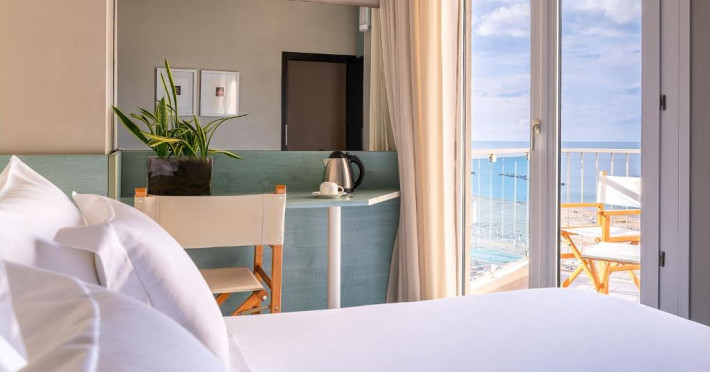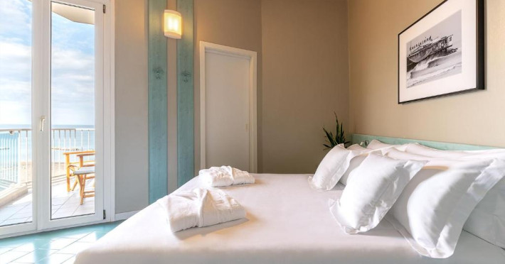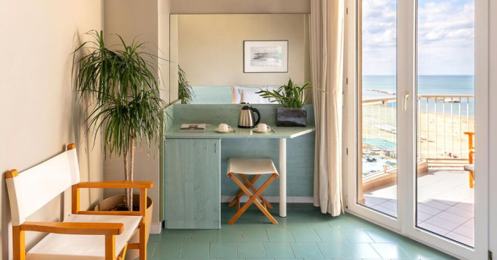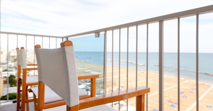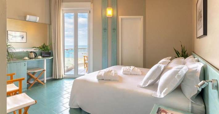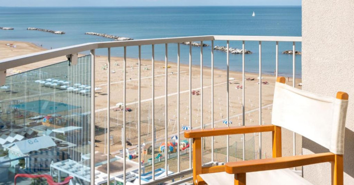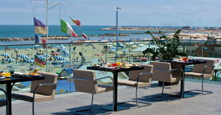 O pasarelă incantătoare din lemn separă terasele hotelului de nisipurile aurii ale plajei din Cattolica, care oferă o multitudine de facilităti.