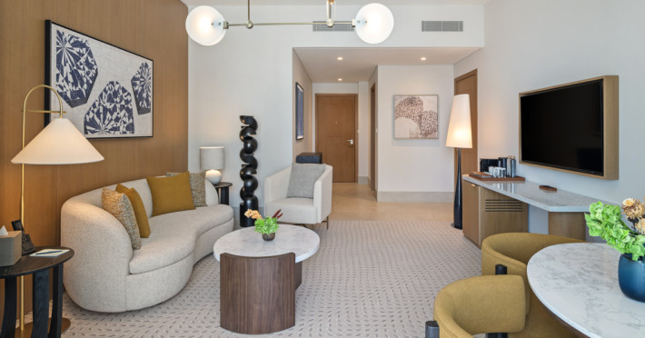 The Lagoon Suite is the ultimate space for a memorable holiday complete with a huge balcony offering jaw-dropping views of the Crystal Lagoon and canal. It’s swanky, artsy