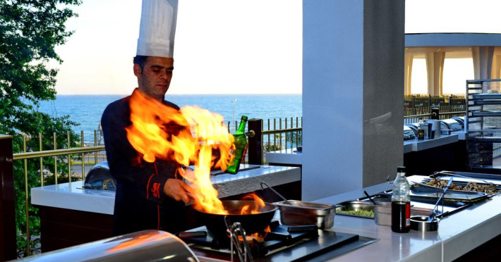 La Vikingen Infinity Resort & Spa oaspeții au la dispoziție 4 restaurante unde pot savura mâncăruri delicioase, în stil bufet sau à la carte. Preparate din bucătăria internațională și italiană sunt oferite zilnic la micul dejun, prânz și cină. Masa poate fi servită atât în interior, cît si în aer liber, pe terasă, în funcție de vreme. 6 baruri, dintre care unul la piscină și unul pe plajă, sunt disponibile cu o ofertă variată de băuturi răcoritoare și alcoolice. În cadrul proprietății există și un snack bar care servește băuturi și gustări.