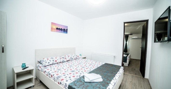 Dubla Matrimoniala este dotata cu pat 160/200, 2 noptiere,dulap, aer conditionat,TV , baie privat cu cabina de dus, lenjerie de pat Li prosoape, plasa de tantari.