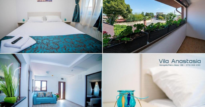 SituatÄ Ã®n Mangalia, la 700m de Plaja Mangalia Èi la 600 de metri de Sanatoriul Balnear Mangalia, Vila Anastasia are un lounge comun, WiFi gratuit Èi grÄdinÄ cu facilitÄÈi de grÄtar. Toate camerele au baie privatÄ Èi TV cu ecran plat Èi canale prin cablu. Pensiunea oferÄ camere de familie. Camerele pensiunii includ aer condiÈionat Èi dulap. Vila Anastasia are o terasÄ la soare. Cel mai apropiat aeroport este Aeroportul InternaÈional Mihail KogÄlniceanu, situat la 62 km de unitatea de cazare. Proprietatea furnizeazÄ serviciu de transfer de la/la aeroport la un cost suplimentar.Datorita dinamicitatii domeniului disponibilitatea ofertelor se modifica de la un moment la altul. De aceea ofertele sunt valabile in limita locurilor disponibile. Agentia nu este responsabila pentru eventualele neconcordante care pot aparea intre informatiile privind tarifele si alte detalii din site si informatiile primite in agentie. In aceste cazuri vor avea prioritate, intotdeauna, informatiile primite in agentie.