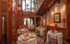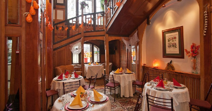 Printr-o spectaculoasa alternanta a lemnului cu vitraliile originale, in care camelia intruneste toate prerogativele unui laitmotiv imagistic, cu oglinzile de calitate si peretii zugraviti sau tapetati, ce imbratiseaza minunata scara interioara, se creeaza un inefabil joc pictural, accentuat de tusele negre. Deasupra, cercul larg al lampadarului din fier forjat, realizat in maniera medievala, completeaza armonios, fara ostentatie, interiorul feeric, aducand un plus de eleganta.
