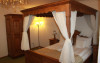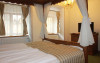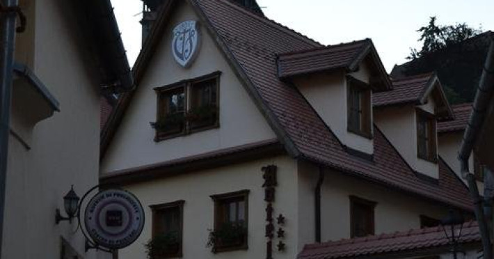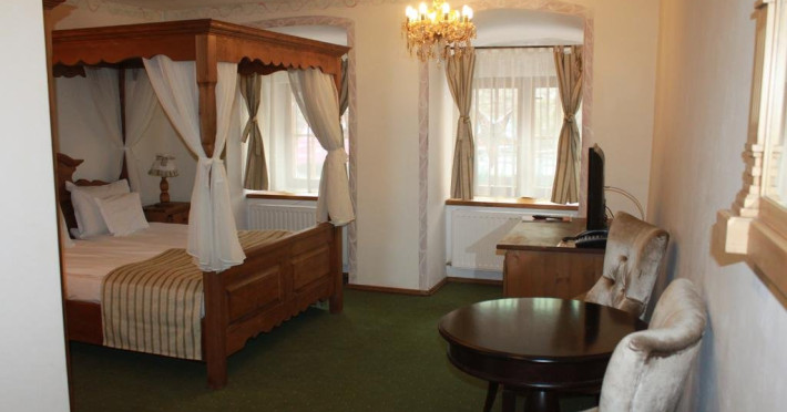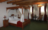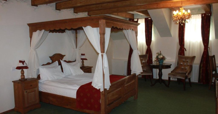 Camera deluxe cu pat baldachin: camera foarte spatioasa (30-36mp) are o vedere minunata asupra Cetati Medievale include mobilier de epoca(ano 1600) din lemn masiv.Mobila rustica compusa din:pat dublu cu baldachin (180 X 210) , sifonier si secretaire, ofera un plus de eleganta si parca se mai simte ambianta medievala de acum 500 de ani si prin pictura peretilor rustica si cu bun gust.Camera mai ofera oaspetilor si o zona de relaxare compusa dintr-o masuta cu 2 fotolii confortabile dar si nelipsitele utilitati moderne : TV prin satelit, telefon, minibar, seif si baie proprie cu cada sau dus si uscator de par.