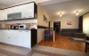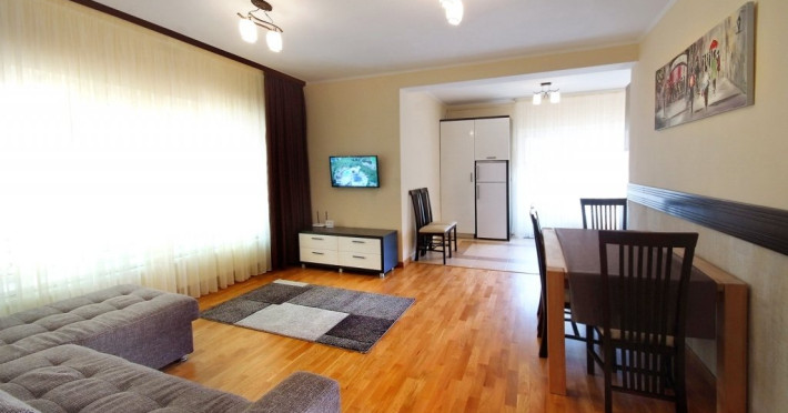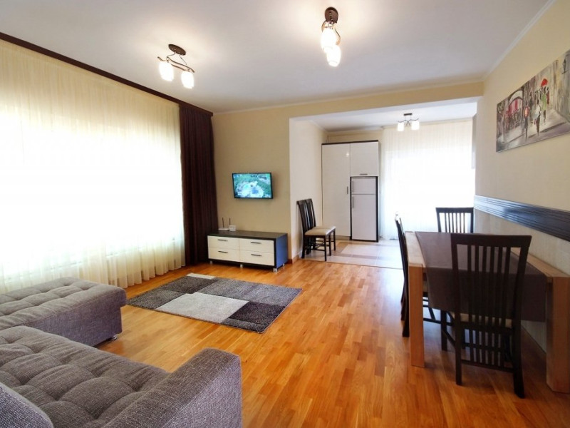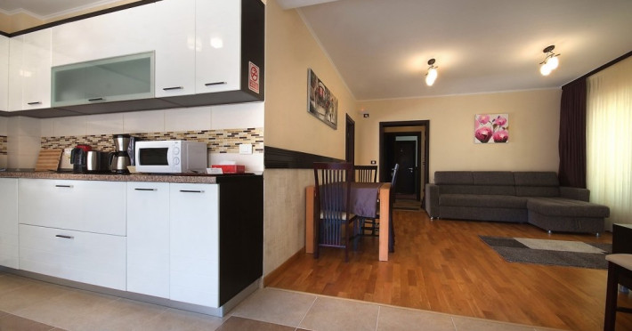 Fiecare apartament are in componenta un living spatios (dotat cu canapea extensibila), loc de servit masa, o camera cu pat matrimonial, baie la dormitor, baie de serviciu, bucatarie tip open space complet utilata si balcon. Toate apartamentele sunt dotate cu cate 2 TV + cablu, internet wireless, incalzire si apa calda asigurata cu centrala proprie pe gaz. Capacitatea maxima a fiecarui apartament este de 4 adulti si un copil sub 4 ani.
