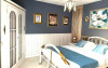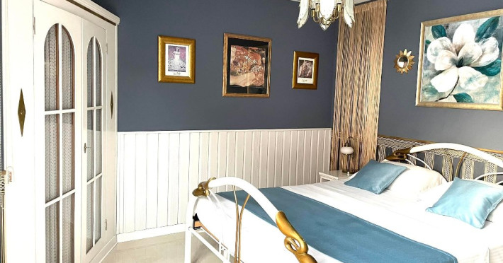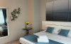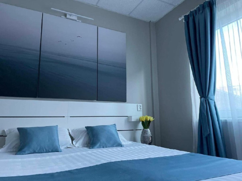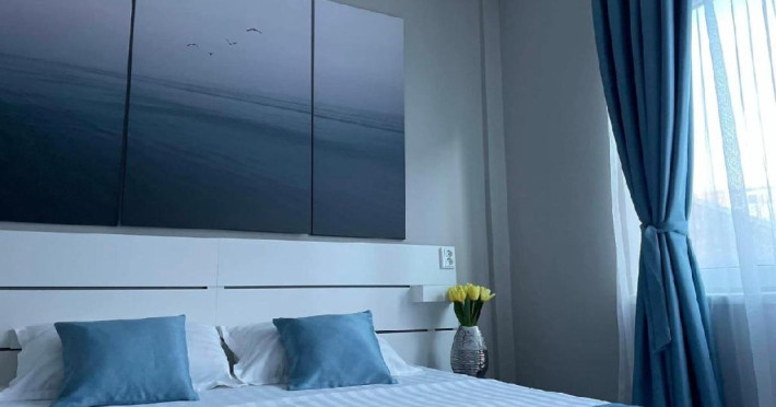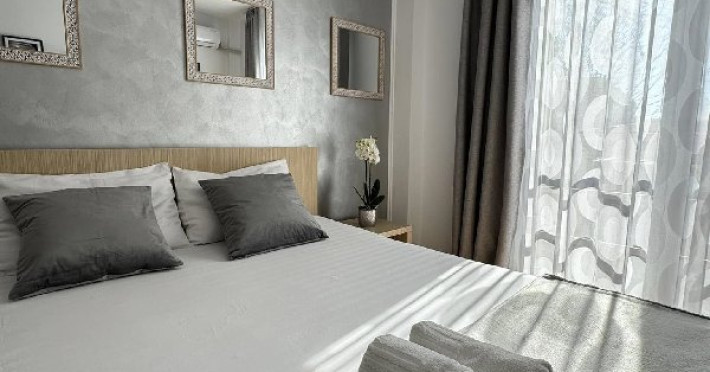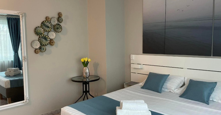 Suita de familie: 2 dormitoare cu pat matrimonial, 1 baie principala, 1 baie serviciu, 2 balcoane.