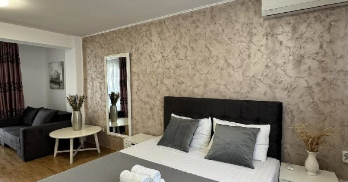 Apartament tip studio: dormitor matrimonial, living cu canapea extensibila, 1 baie.