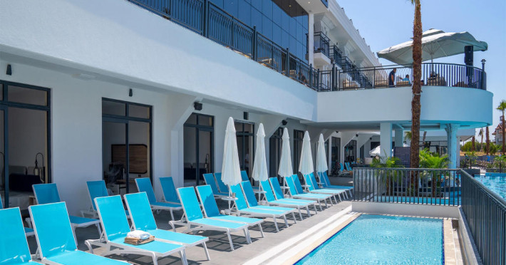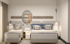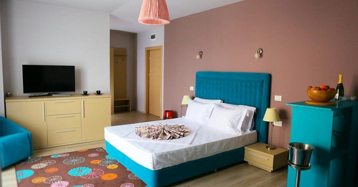Suita Deluxe, cu o suprafata de 60 mp, este formata din doua camere fiecare cu pat matrimonial, separate printr-o usa, hol si dressing, AC, TV, internet, minibar, baie cu dus, uscator de par, balcon.