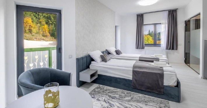 Superioara family - ocupare max 4 persoane, avand o suprafata de aprox 36 mp, pat matrimonial, living cu canapea extensibila, baie cu cada, produse cosmetice, tv, chicineta cu minifrigider, microunde, espresor cafea, plita, hota, ghiuveta, masuta cu 4 scaune.