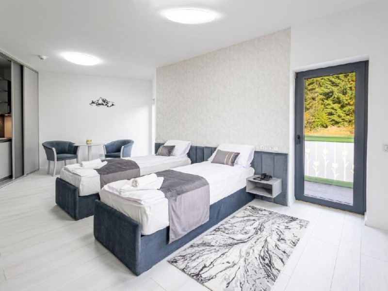 Standard twin cu balcon - ocupare max 2 persoane, avand o suprafata de aprox 20 mp, paturi twin, balcon, baie cu dus, produse cosmetice, tv, chicineta cu minifrigider, microunde, espresor cafea, plita, hota, ghiuveta.