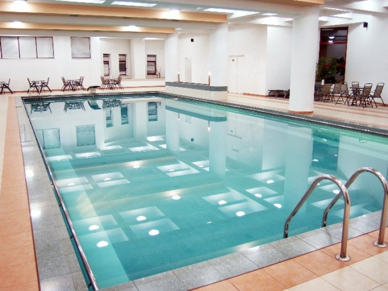 Complexul dispune de cea mai mare piscina acoperita din statunea Slanic Moldova. Apa este mentinuta la temperatura de 30 grade C iar temperatura ambientala la 30 grade C. Piscina este de dimensiuni semiolimpice, avand lungimea de 21 m si latimea de 9 m. Adancimea acesteia porneste de la 1.60 m si ajunge la 3.20 m. Accesul la piscina este gratuit. Vara se deschide si terasa pentru plaja putand astfel admira peisajul montan direct din piscina.