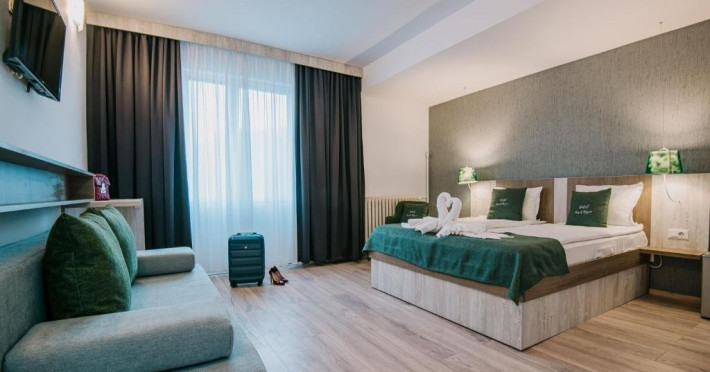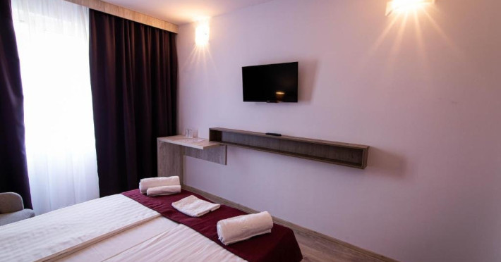 Dubla Deluxe: pat matrimonial, baie cu dus, papuci de casa, uscator de par, televiziune prin cablu/satelit, frigider, garderoba, birou. (Suprafata: 16mp)