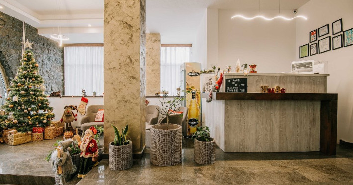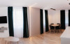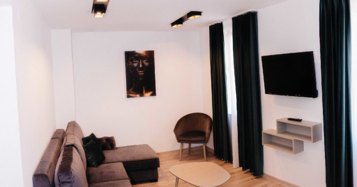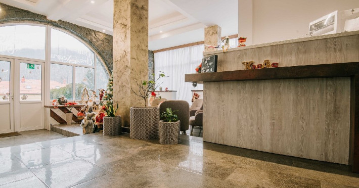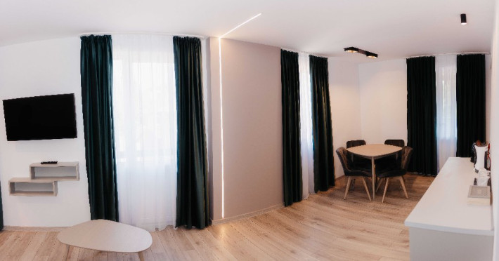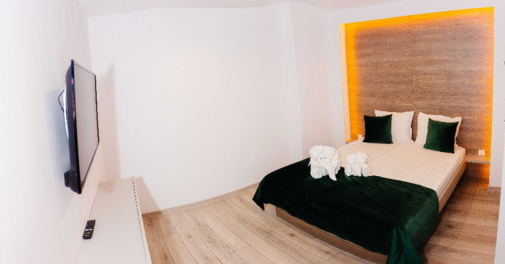 - Apartament queen: suprafata de 30 mp, dispune de baie cu dus, papuci de casa, uscator de par, frigider, garderoba, birou.