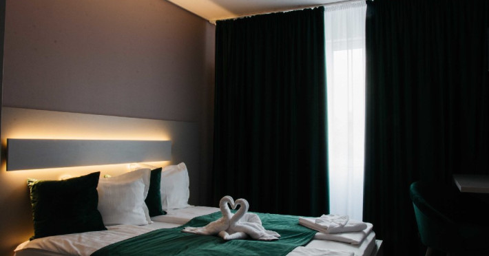 - Camera dubla deluxe cu balcon: suprafata de 16 mp si facilitati standard (baie cu dus, papuci de casa, uscator de par, tv prin cablu/satelit, frigider, garderoba si birou).
