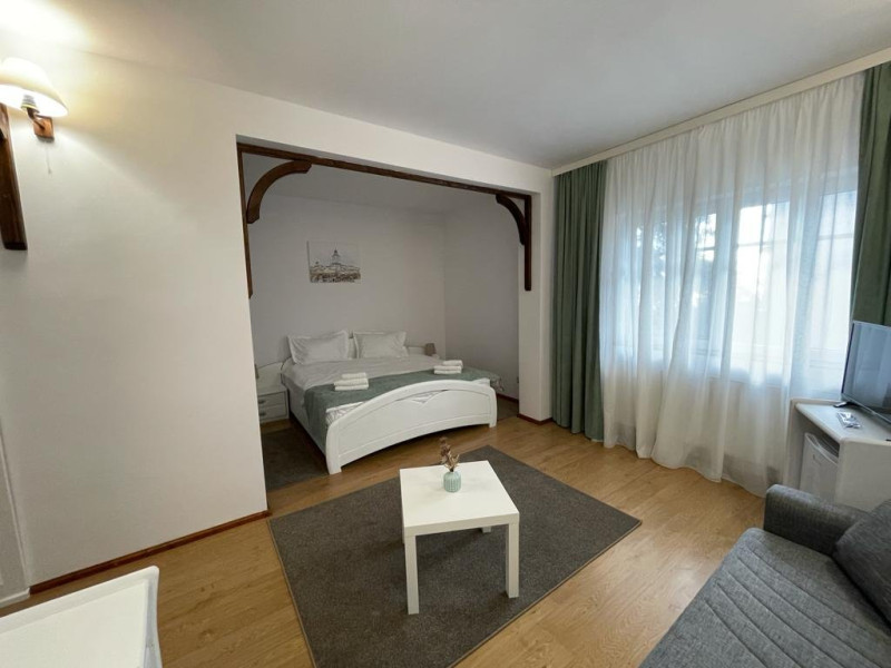 Junior Suite Deluxe cu suprafata de 35 mp dispune de un open space in care se afla un pat matrimonial si un pat single, balcon.