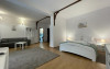 Junior Suite Deluxe cu suprafata de 35 mp dispune de un open space in care se afla un pat matrimonial si un pat single, balcon.