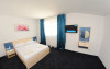 Dormitorul este prevazut cu pat matrimonial, sifonier in 3 canate, oglinda si pardoseala acoperita cu mocheta. Toate baile sunt prevazute cu cabina de dus.