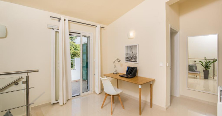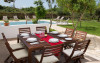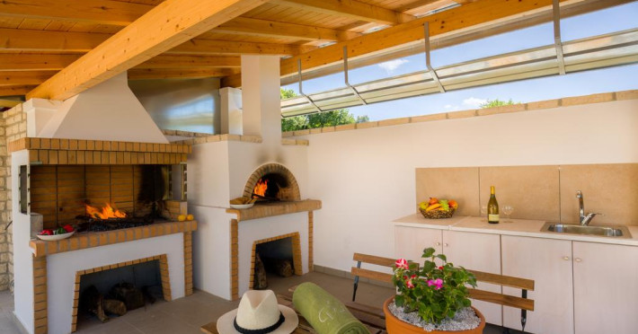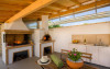 The outdoor area includes the swimming pool, the sunbeds and the umbrellas, the barbecue, the outdoor dining area parking space for one car as well as a shower.
