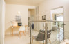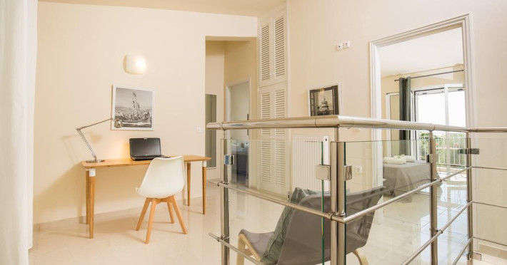 The first floor features a desk area, two more bedrooms with balconies and two bathrooms.