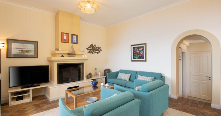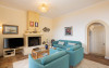 armchairs positioned around feature fireplace. TV with DVD, Satellite and