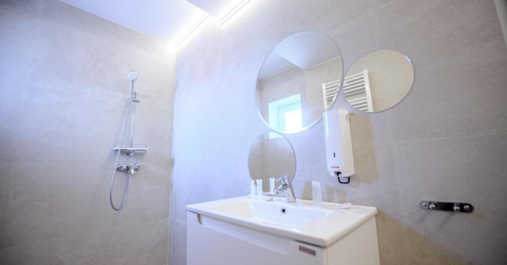 - 2 camere DBL cu pat matrimonial, dulap, TV, AC, 1 baie cu cada, iesire la balcon;