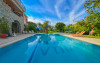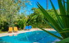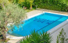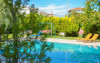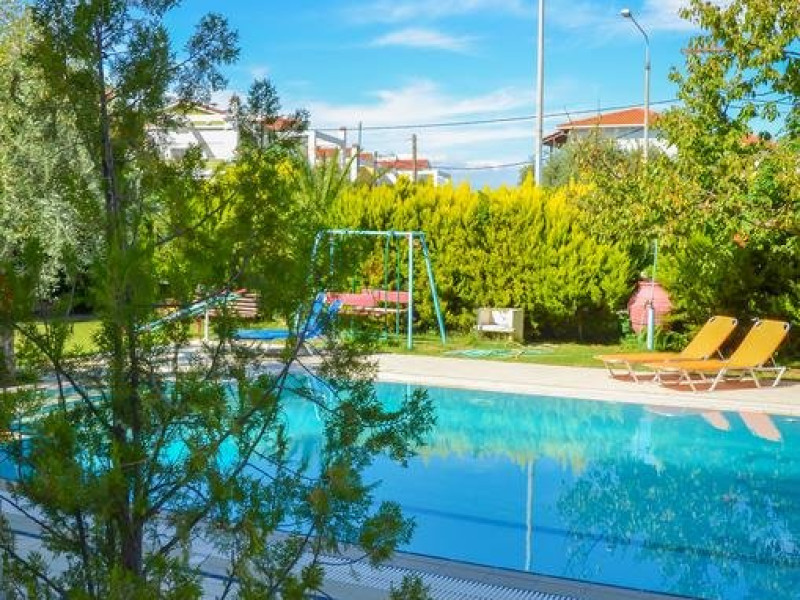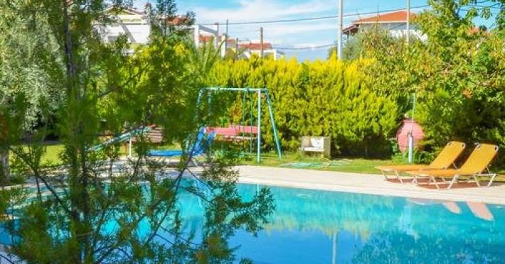 Parcare (gratuita), gradina, piscina exterioara, sezlonguri si umbrele la piscina.