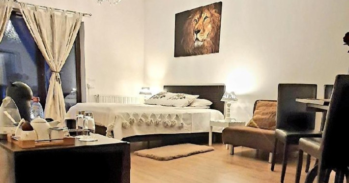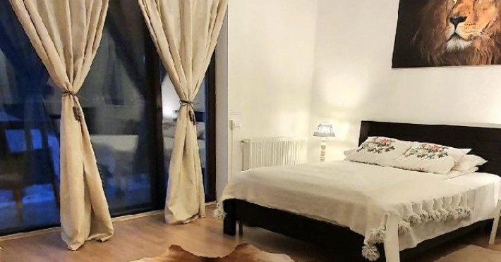 Apartamentul Deluxe include un pat matrimonial de 160 x 200 cm, o canapea extensibila, doua fotolii, TV smart cu ecran plat si un ecran plat cu cititor DVD incorporat, minibar, espresor, baie cu dus cervical, balcon cu vedere catre masivul Bucegi, Crucea Eroilor si Manastirea Caraiman.