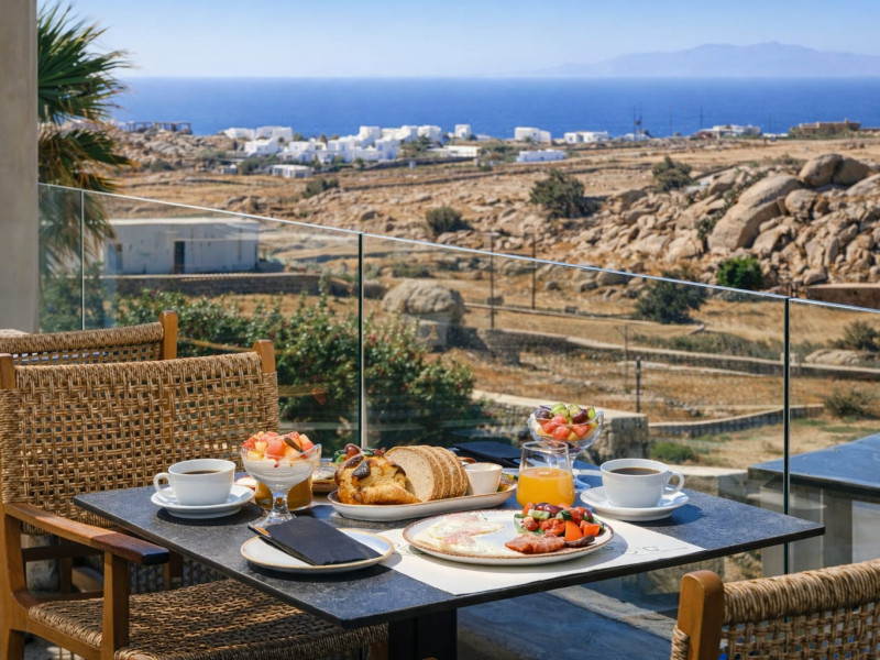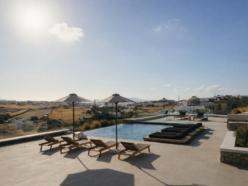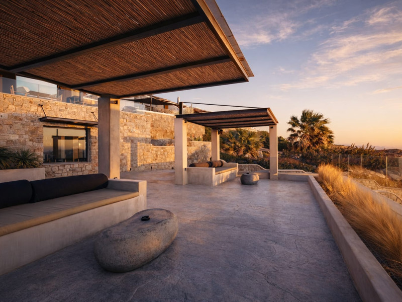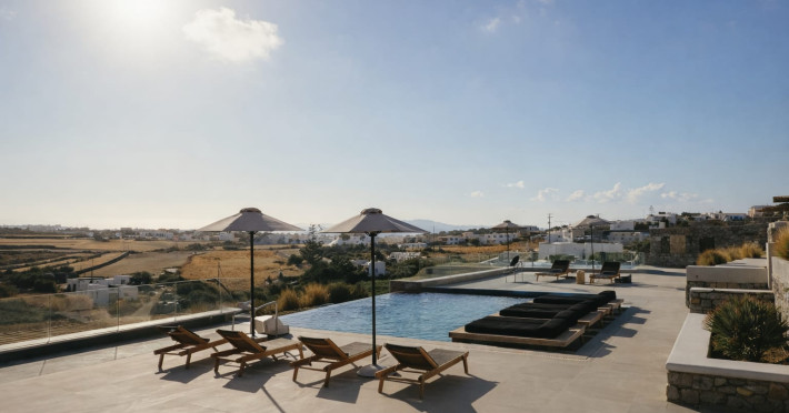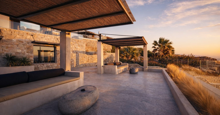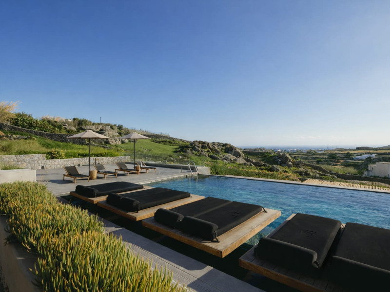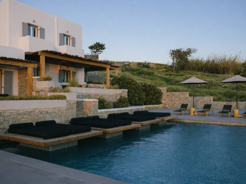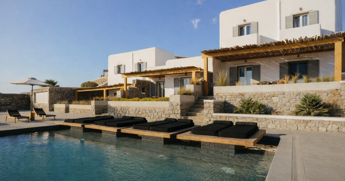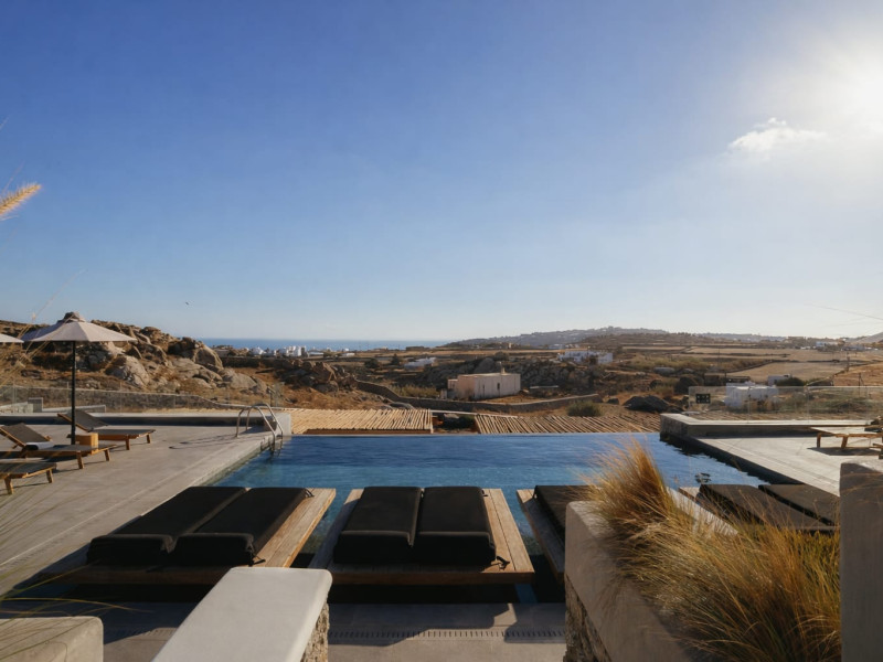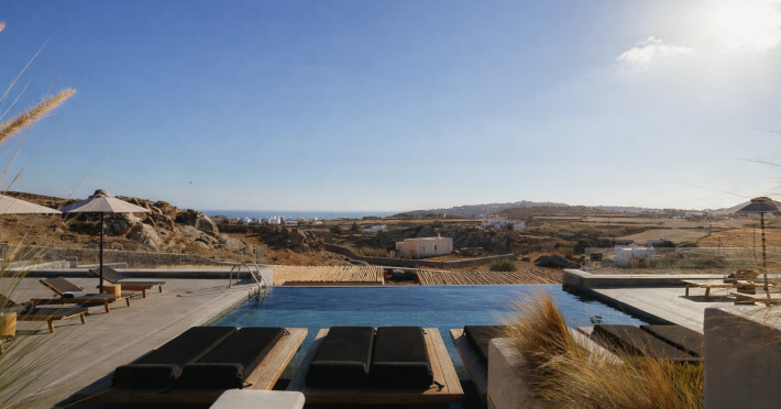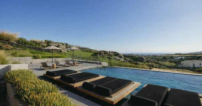 Located in a key position on the road to the renowned Paradise Beach, almost in the center of the island, Villa Evi offers direct access to the airport (0.2 mi.), the new harbor of Mykonos (1.86 mi.), the picturesque Chora (0.9 mi.) and the famous beaches, making it an ideal choice for those who want privacy and fast short trips.Following a private road overlooking the quintessential views of Mykonian landscape, you reach your destination for this summer, Villa Evi. In a restricted, quiet location with unparalleled panoramic views of the Aegean Sea and the Mykonian sunsets, the luxurious complex is ideal for moments of absolute serenity, peace and tranquility, away from the large crowds.Built according to local architectural standards, the newly constructed building compliments its natural surroundings and is in perfect harmony with the land of Mykonos, honoring the Cycladic constructional forms. Villa Evi includes four luxury villas, ideal for couples, groups and VIPs, who seek luxury, modern amenities and personalized service every moment of the day.Located in a key position on the road to the renowned Paradise Beach, almost in the center of the island, Villa Evi offers direct access to the airport (0.2 mi.), the new harbor of Mykonos (1.86 mi.), the picturesque Chora (0.9 mi.) and the famous beaches, making it an ideal choice for those who want privacy and fast short trips.Following a private road overlooking the quintessential views of Mykonian landscape, you reach your destination for this summer, Villa Evi. In a restricted, quiet location with unparalleled panoramic views of the Aegean Sea and the Mykonian sunsets, the luxurious complex is ideal for moments of absolute serenity, peace and tranquility, away from the large crowds.Built according to local architectural standards, the newly constructed building compliments its natural surroundings and is in perfect harmony with the land of Mykonos, honoring the Cycladic constructional forms. Villa Evi includes four luxury villas, ideal for couples, groups and VIPs, who seek luxury, modern amenities and personalized service every moment of the day.