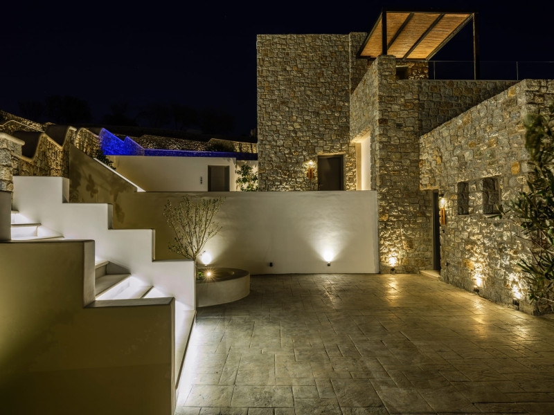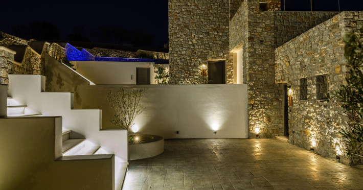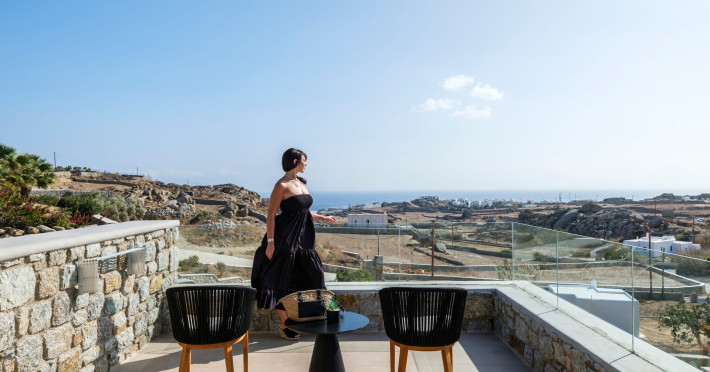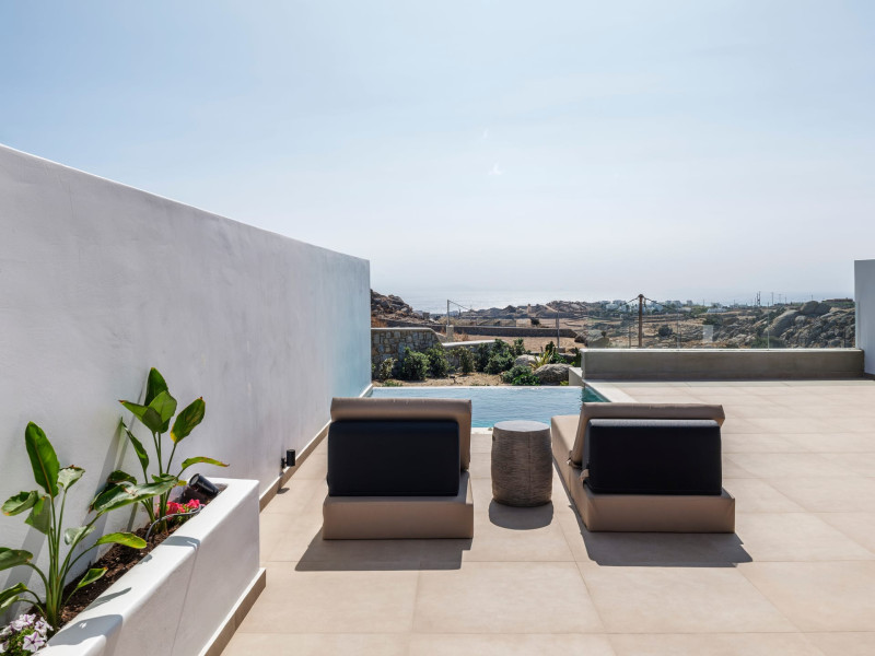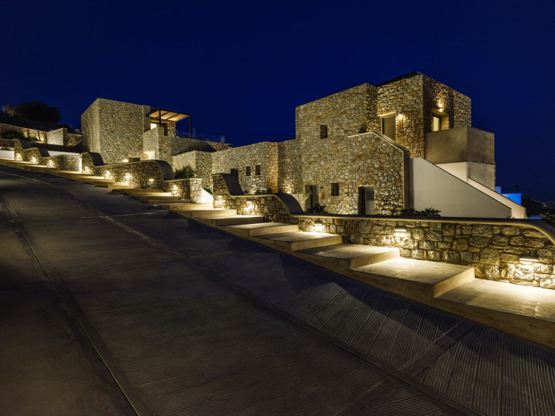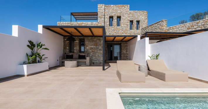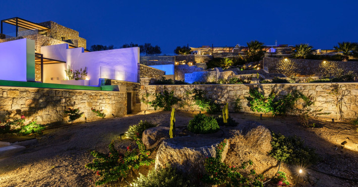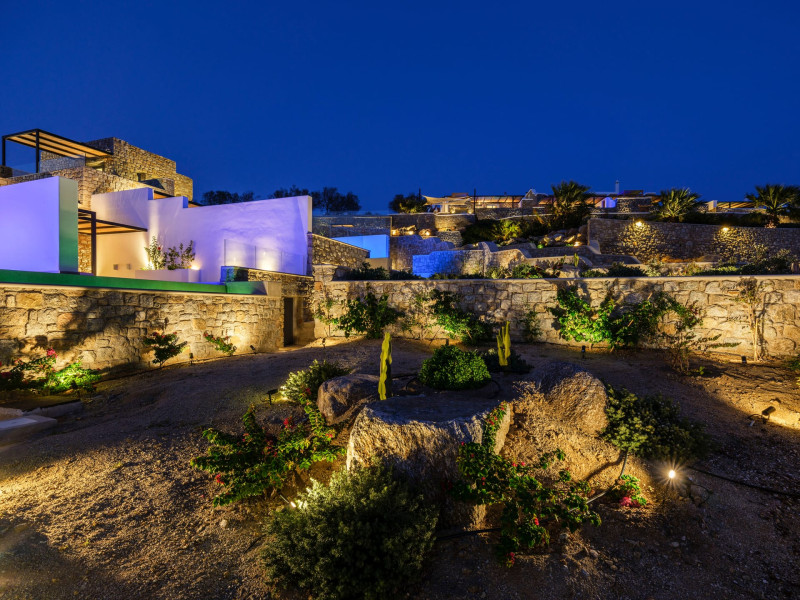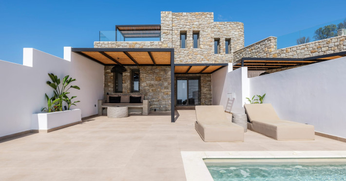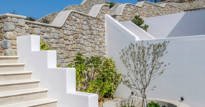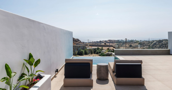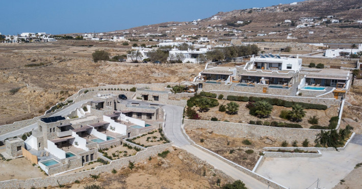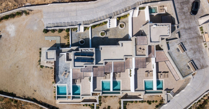 Built according to local architectural standards, the newly constructed building compliments its natural surroundings and is in perfect harmony with the land of Mykonos, honoring the Cycladic constructional forms. Villa Evi includes four luxury villas, ideal for couples, groups and VIPs, who seek luxury, modern amenities and personalized service every moment of the day.