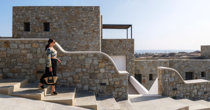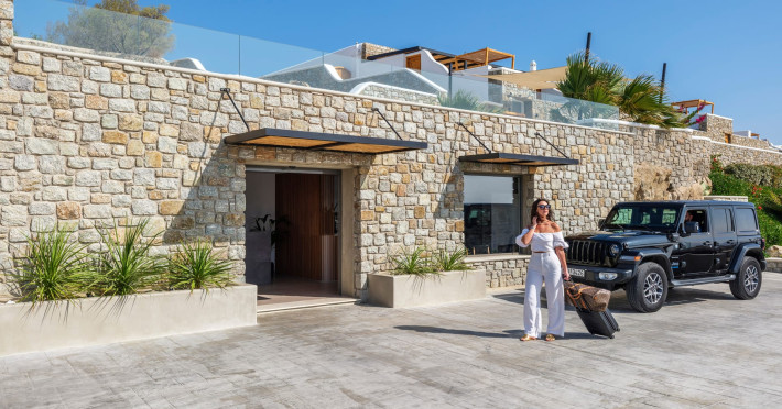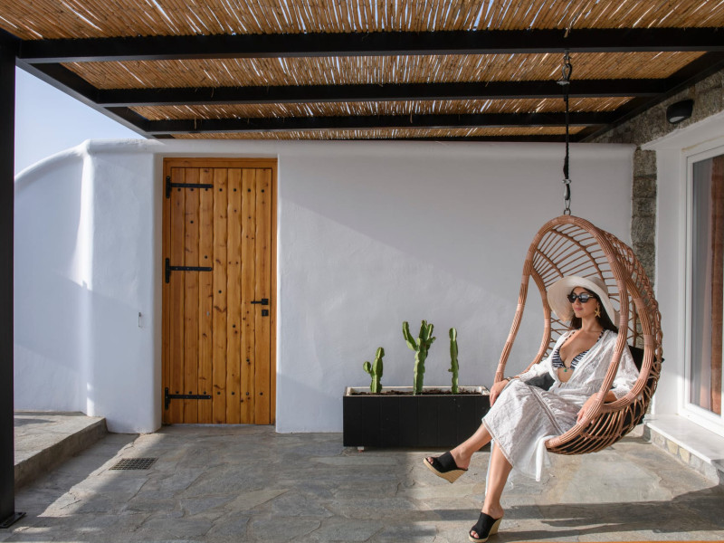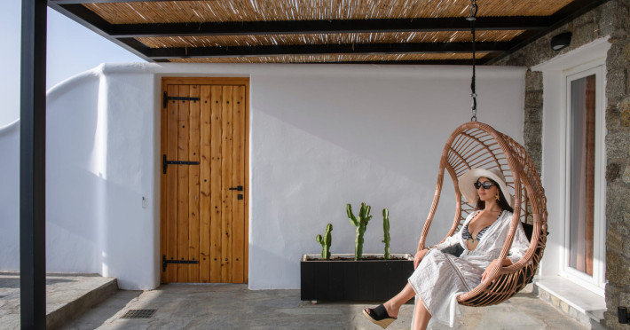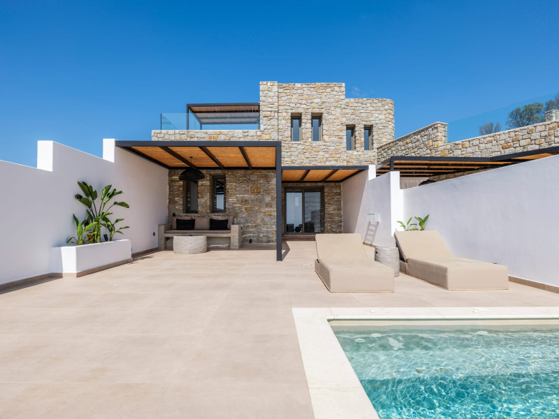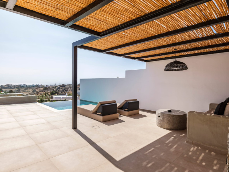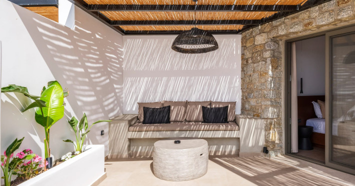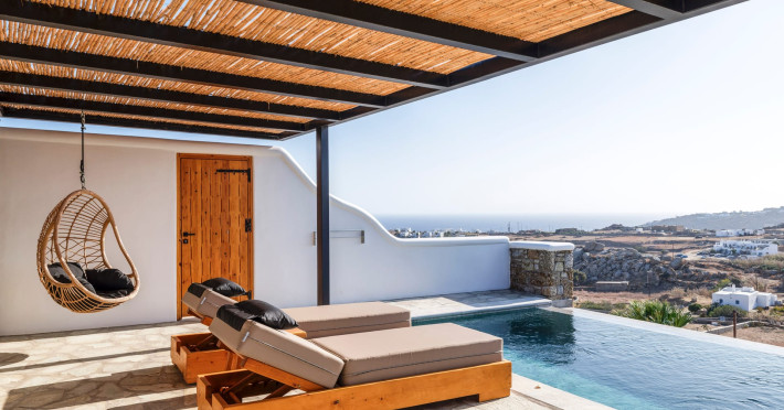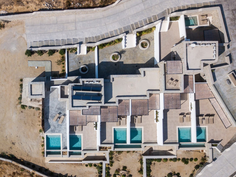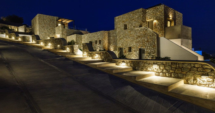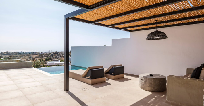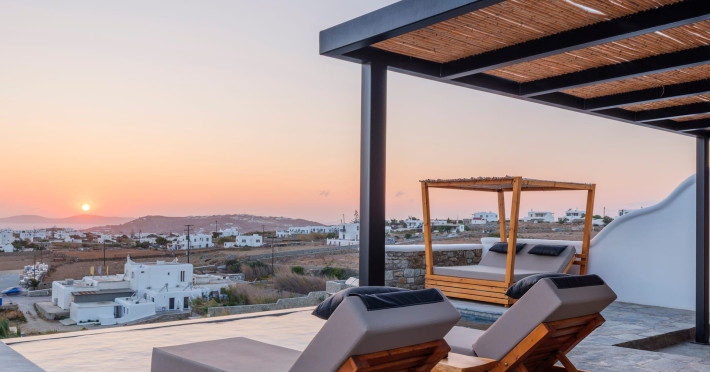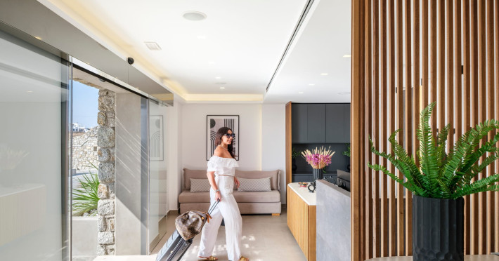 Built according to local architectural standards, the newly constructed building compliments its natural surroundings and is in perfect harmony with the land of Mykonos, honoring the Cycladic constructional forms. Villa Evi includes four luxury villas, ideal for couples, groups and VIPs, who seek luxury, modern amenities and personalized service every moment of the day.