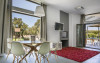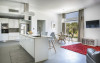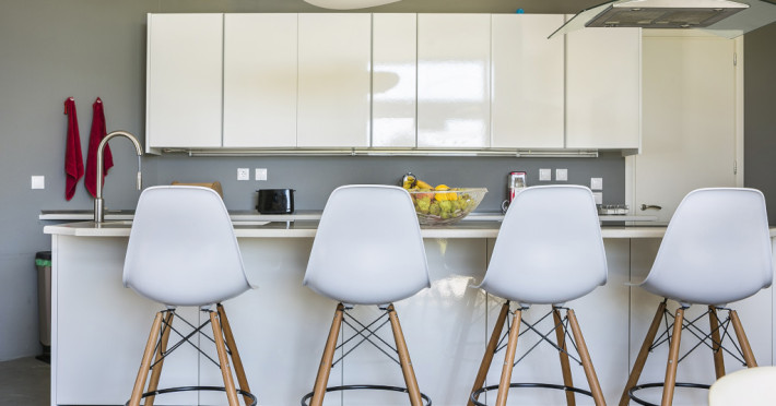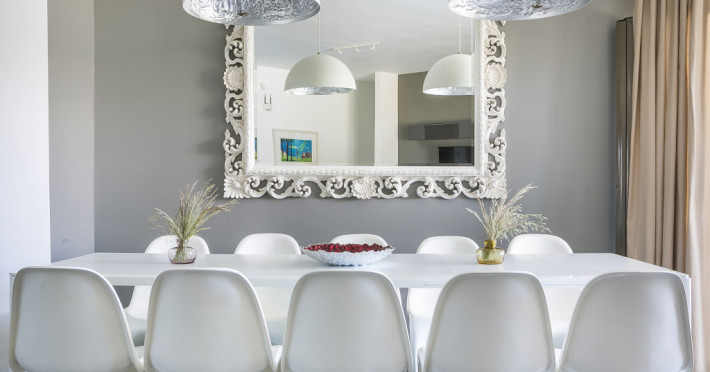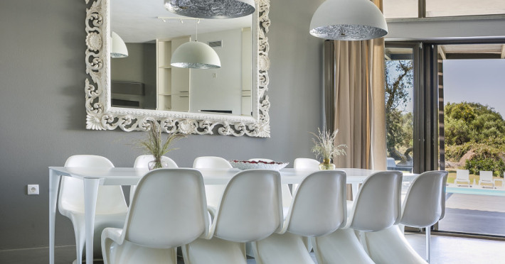A huge, plump sofa stretches across the living area, inviting you to put your feet up and watch a movie or catch up on some holiday reading. A striking dining suite seating ten people nestles beside the huge bifold doors that open out onto the poolside terrace, ideal for more formal meals or celebrations.