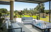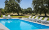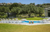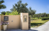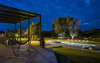 Outside, a magnificent covered terrace runs across the back of the house, providing welcome shade and a choice of seating areas overlooking the gardens. The dove grey concrete flooring extends to the outside terraces, creating an attractive contrast to the lush green lawns and bright turquoise pool. Beyond is a collection of characterful old olive trees, beautifully framing the lovely view and providing a charming backdrop for alfresco dining on the terrace where the all-essential barbecue resides.