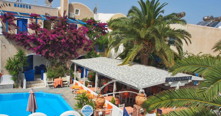 Villa Markos is a traditional hotel located in Perissa beach, the famous black beach in Santorini, owned by a local family since 1985. Preserving the traditional Greek cycladic style, Villa Markos hotel offers 15 studios and apartments in a privileged location only, few steps from the beach. The hotel offers an outdoor seasonal swimming pool with sunbeds and umbrellas and a traditional Greek tavern with plenty of local dishes daily. We promise you an unforgettable stay in Santorini!Villa Markos is a traditional hotel located in Perissa beach, the famous black beach in Santorini, owned by a local family since 1985. Preserving the traditional Greek cycladic style, Villa Markos hotel offers 15 studios and apartments in a privileged location only, few steps from the beach. The hotel offers an outdoor seasonal swimming pool with sunbeds and umbrellas and a traditional Greek tavern with plenty of local dishes daily. We promise you an unforgettable stay in Santorini!