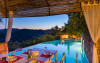 Infinity style pool and large sitting and dinning areas are incorporated in a