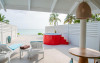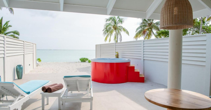 Construit pe picioroange fixate în lagună, acest spaţios bungalou oferă o terasă la soare privată şi un bideu.